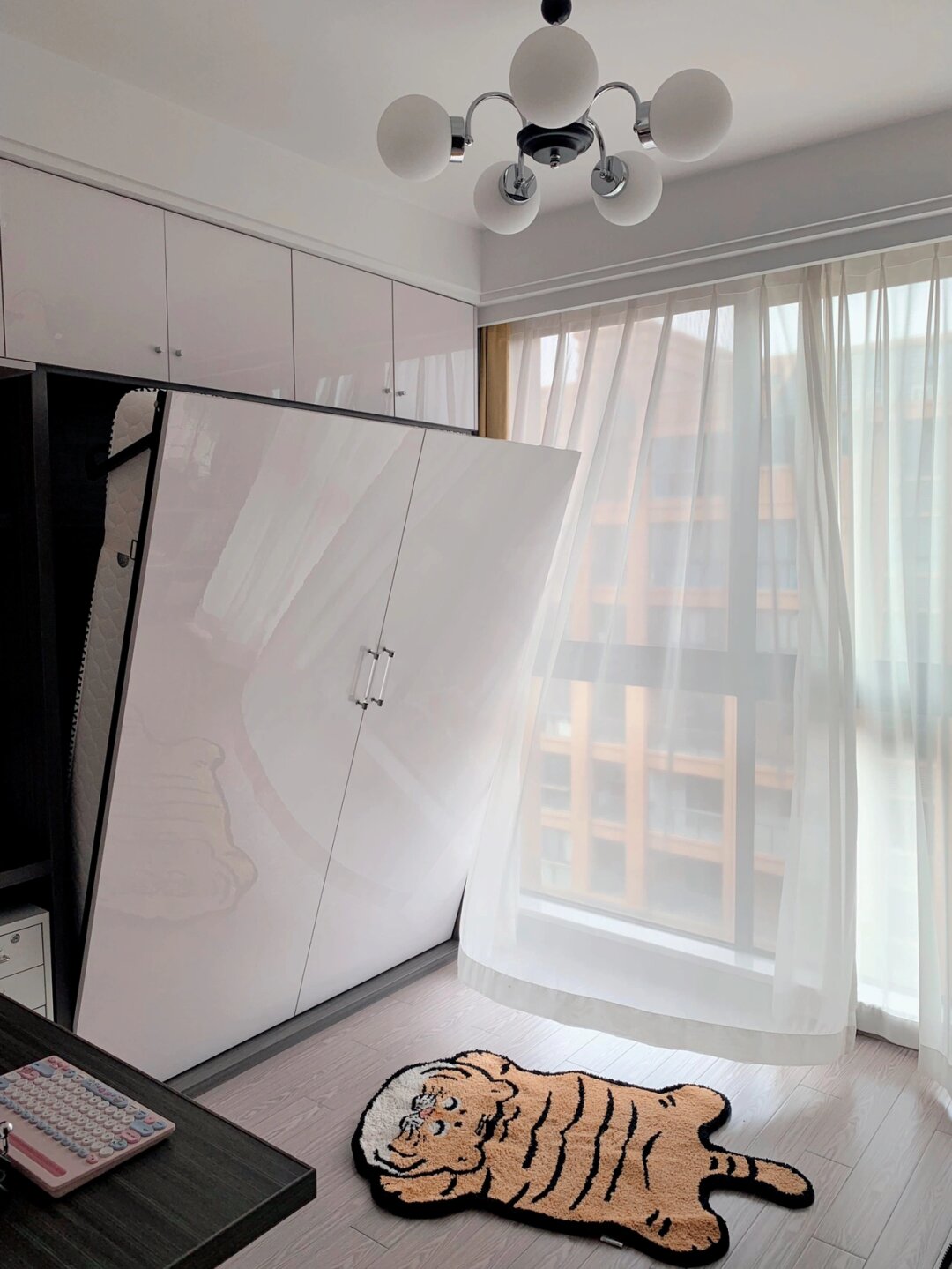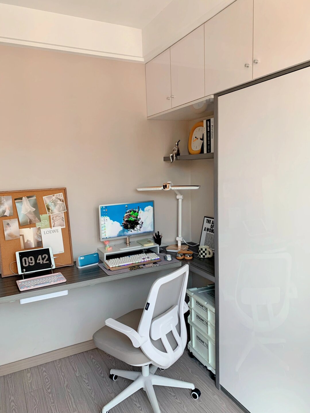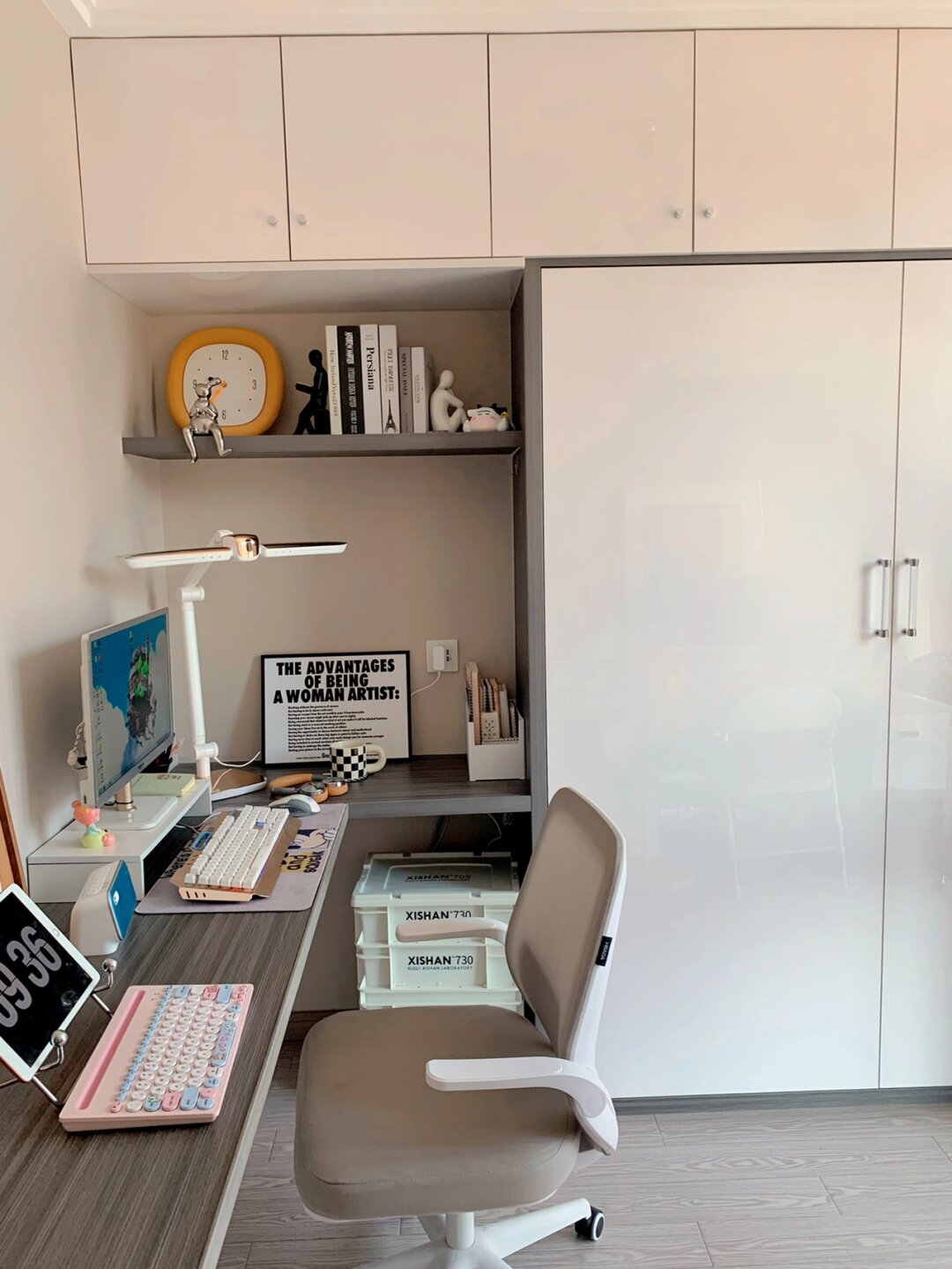 7㎡卧室大改造,L型半包围书桌可太香了吧 我家空出来的小房间7平左右,为了能实现休息,学习,娱乐改造成了一下 关于房间尺寸:2.7m×2.7m 关于隐形床:1.5m×1.9m 不做传统的榻榻米,而是做了一个隐形床,直接可以翻起来收纳 关于书桌: 旁边做了一排L型书桌1.83m长,0.5m宽,底下用三脚支架固定墙上,平时居家办公,学习都在这 关于书桌好物: 书桌用品都很简单,一台工作电脑,一台护眼灯,桌面小,所以加了一个增高支架 最近暑假上网课,安排了曲悦小U学习音箱,小巧一个,体验还蛮不错的,三种模式可以切换。 上直播课时,人声清晰,听起来很自然。平时休息时我都会用它听听音乐,放松娱乐。 . 飞利浦A7智能护眼台灯,简约大气,日常用来办公,学习都很合适。光照面积大,整个长书桌都能照着。无极调节色温和亮度。我很喜欢它的40分钟休息提醒,用来阅读学习,更高效。自带智能夜灯模式设置,再也不怕晚上抹黑上床了 夜深人静的时候,听着音乐,戴着无线耳机,柔和的光线下,整个状态非常惬意放松。 . 桌底下还放了个收纳箱,里面放着各种小零食桌底下还放了个收纳箱,里面放着各种小零食 . 一间可以休息,娱乐,办公的书房,真的是爱了~
