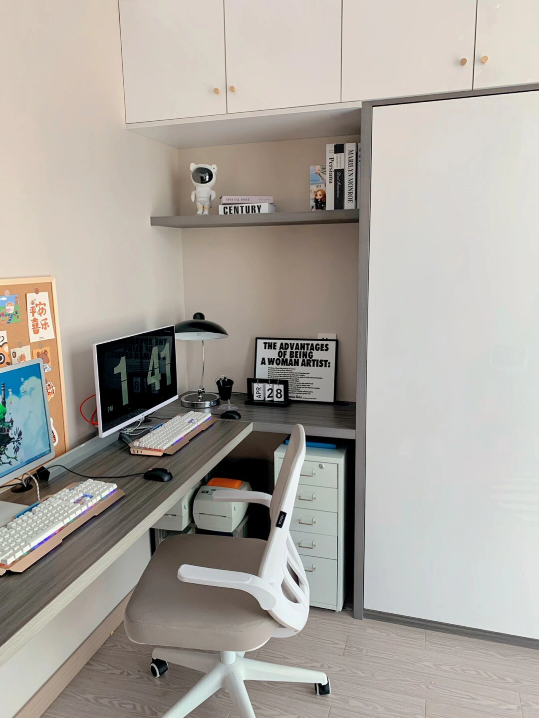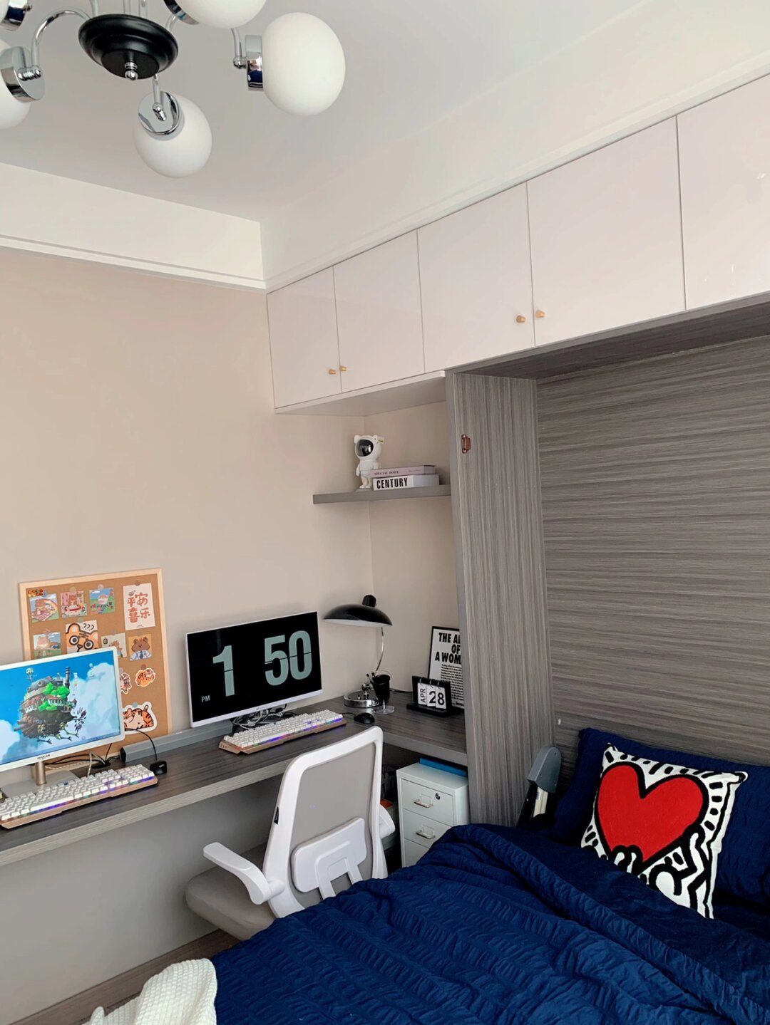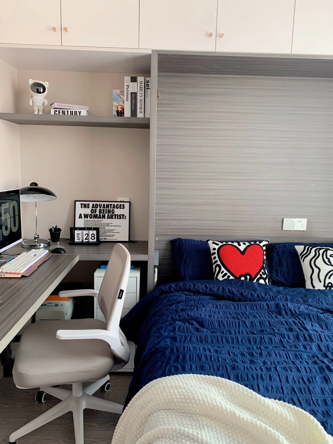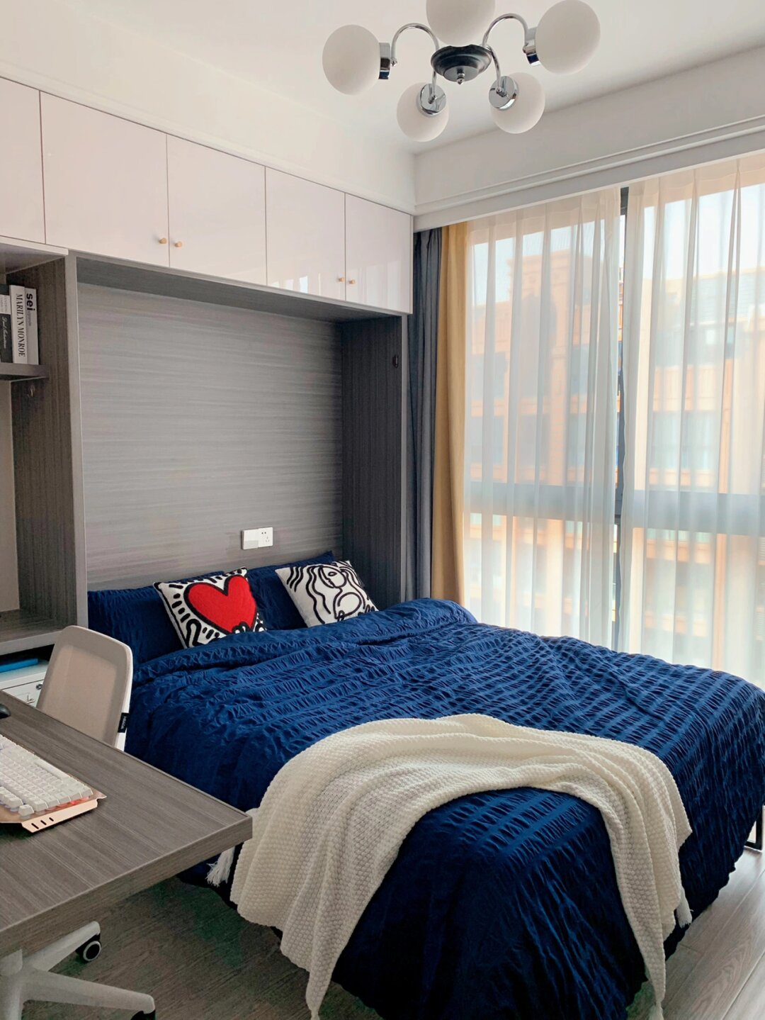 7m2小书房这样装,邻居都跑来抄作业了 我真的太爱我家的小书房了,虽然不是榻榻米房间,但是我却觉得更实用,7m2让就我打造出了一个多功能 办公 | 休息 | 阅读一样都不能少 有人说想要做瑜伽,不错,很适合! —— 关于隐形床 1.5×1.9米,床架是直接入的,床箱还有柜子,书桌都是我们家木工现场打出来哦。 床箱厚度35公分,平时很少用到,仅仅是为了父母偶尔来居住才想出来的! . 关于书桌 书桌是悬浮设计,下面安装了2个三角铁架,非常的牢固哈,有条件的可以在下面加一排抽屉更加实用 . 关于空间利用 很多人觉得浪费了一个空间,而我并不觉得,因为本身床箱厚度仅35公分,并不是太大,床尾的位置其实还可以做柜子储存,只是觉得暂时没有必要,想根据孩子成长灵活运用起来,阅读区,玩耍区都能改造 . 关于吊顶 吊顶是做了一圈双眼皮吊顶,没有加宽,房间很小,所以就挂了一个比较中古的吊灯,这样就不会显得空间太小 —— 好啦,今天就唠到这里了,还有什么不明白评论区见[比心]