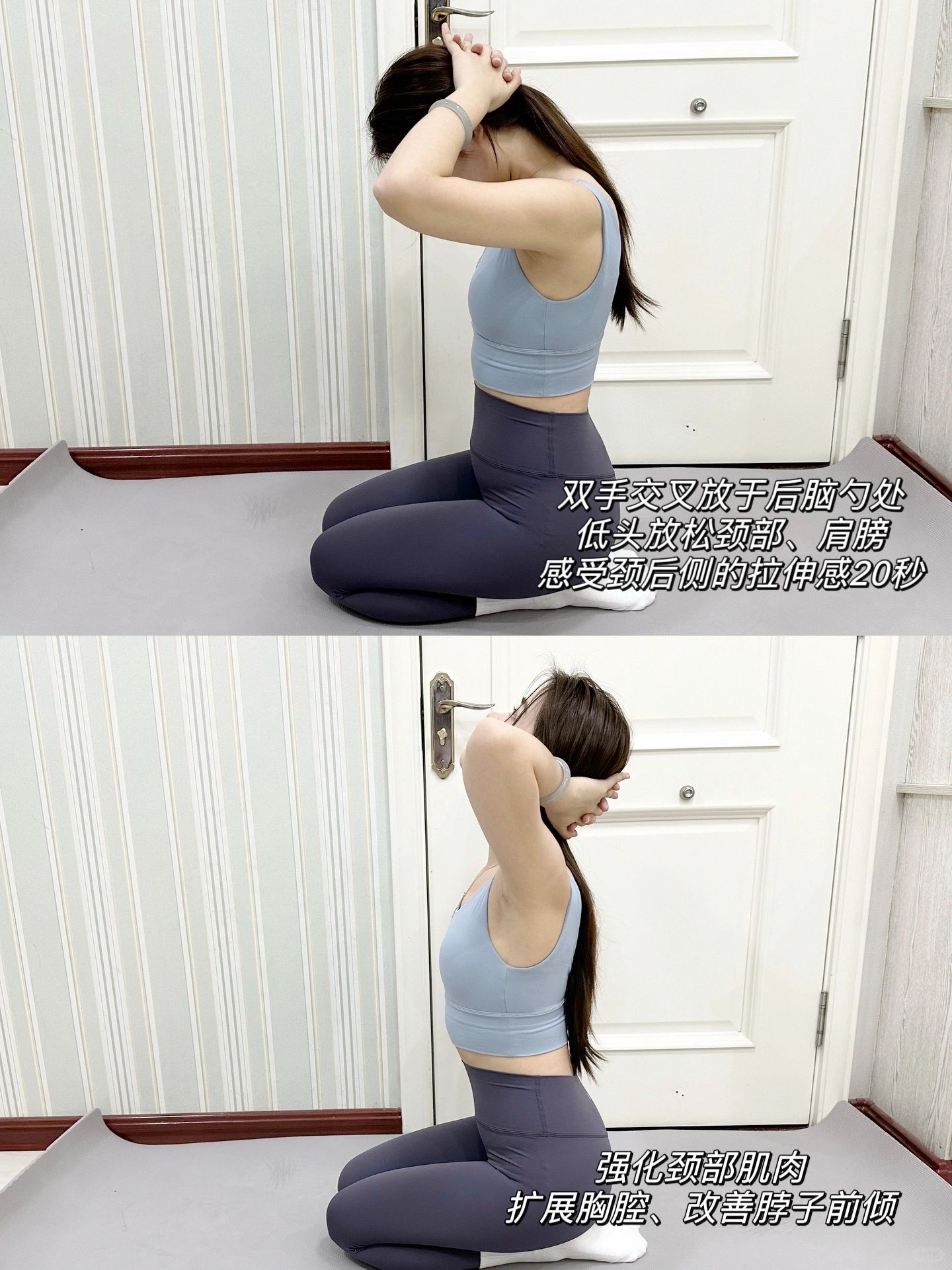 如果你也长期伏案工作/长期低头,脖子和后背经常感觉酸痛,从侧面看脖子前倾,有富贵包 这套简单的瑜伽动作可以帮到你不限制时间场地随时可以练习! 每个动作坚持30-50秒,一次两组 不仅可以改善脖子前倾等体态问题还能提升气质、释放肩颈压力缓解不适哦~