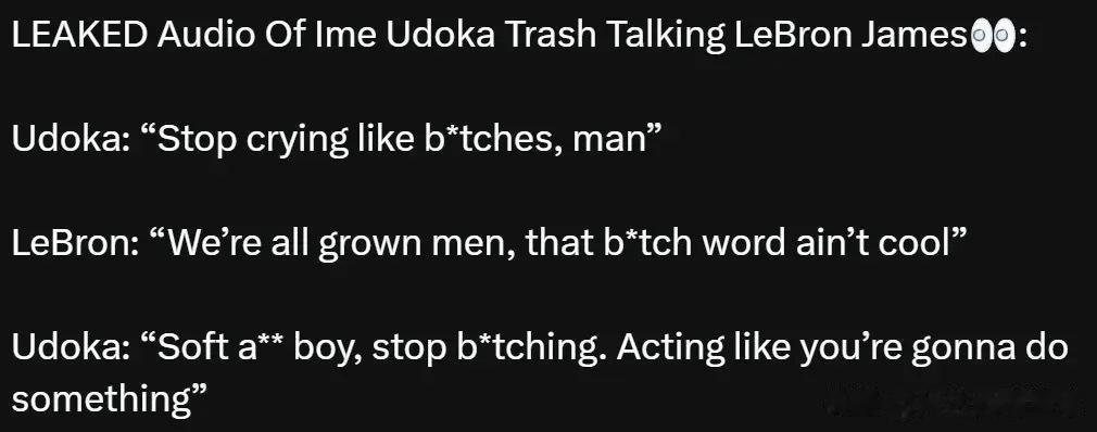 昨日詹姆斯乌度卡口角内容流出,乌度卡直接称詹姆斯为贱人 昨天火箭以97-107不敌湖人。 比赛进行到第四节,勒布朗-詹姆斯与火箭主帅乌度卡也出现口角,最终两人都领到技术犯规,乌度卡累计2T被驱逐。 今天双方的谈话内容流出: (詹姆斯抱怨判罚) 乌度卡:“别像个贱人一样哭哭啼啼的。” 詹姆斯:“我们都是成年人了,用贱人这个词并不好。别乱用。” 乌度卡:“没错,我用了。” 詹姆斯:“别乱用。” (詹姆斯走近,裁判介入) 乌度卡:“你想做什么?软蛋,别逼逼了。说的好像你要干什么一样。” #詹姆斯乌度卡对话内容曝光##NBA新赛季##湖人VS火箭#