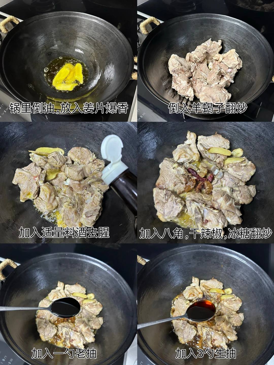 2️⃣锅里倒油,放入生姜爆香,倒入羊蝎子翻炒,加入适量料酒去腥,加入八角,干辣椒,冰糖翻炒