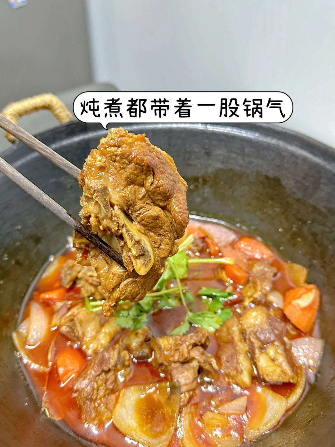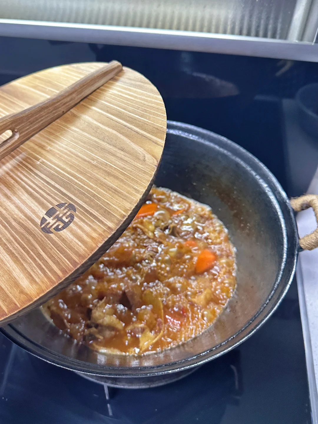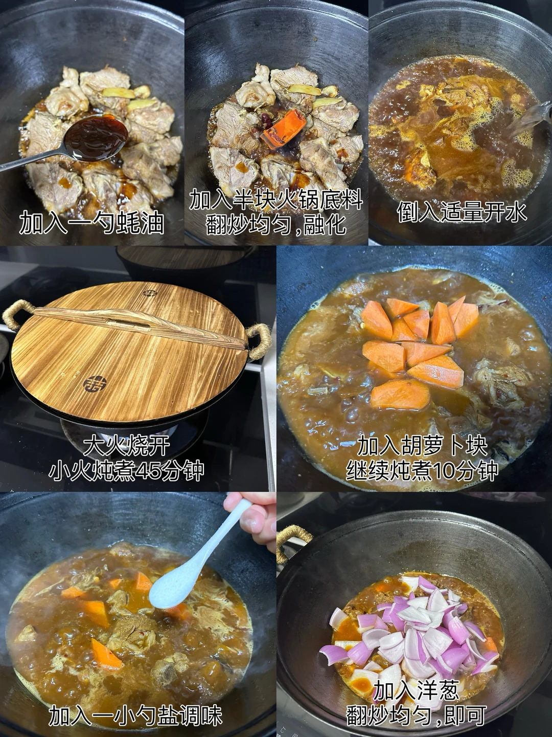 3️⃣加入一勺老抽,3勺生抽,一勺蚝油,加入半块火锅底料,翻炒均匀,融化,加入适量开水,大火烧开,小火炖煮45分钟,加入胡萝卜继续炖煮10分钟,加入一小勺盐调味,加入洋葱,翻炒均匀,即可