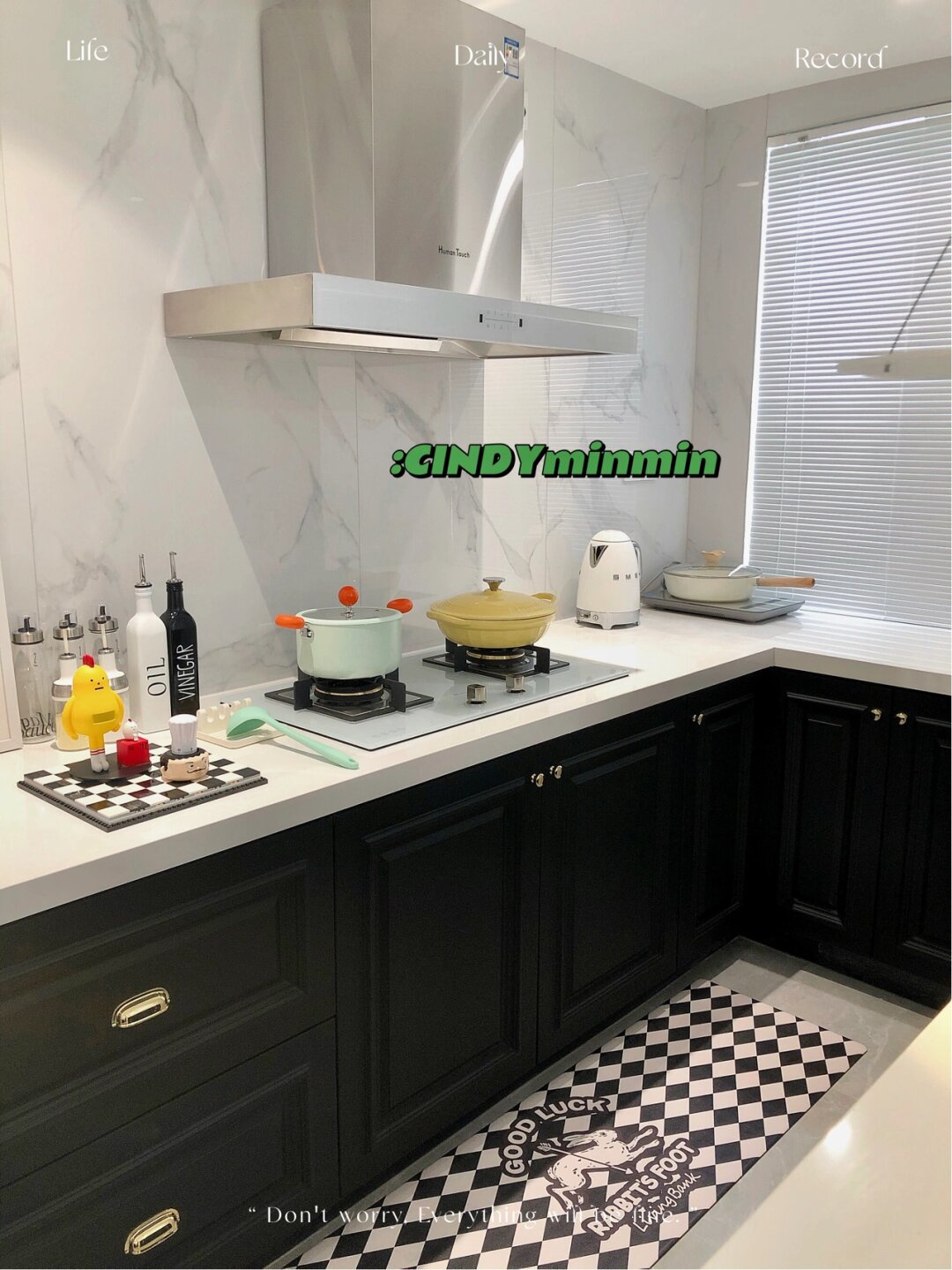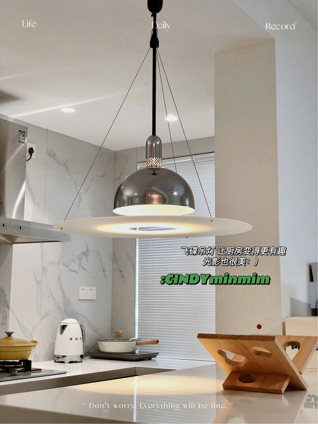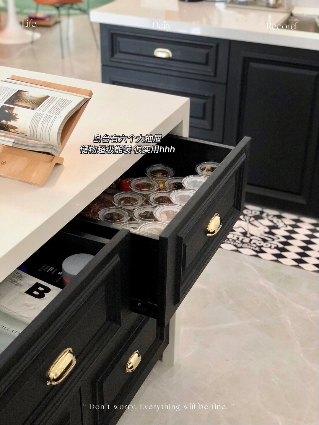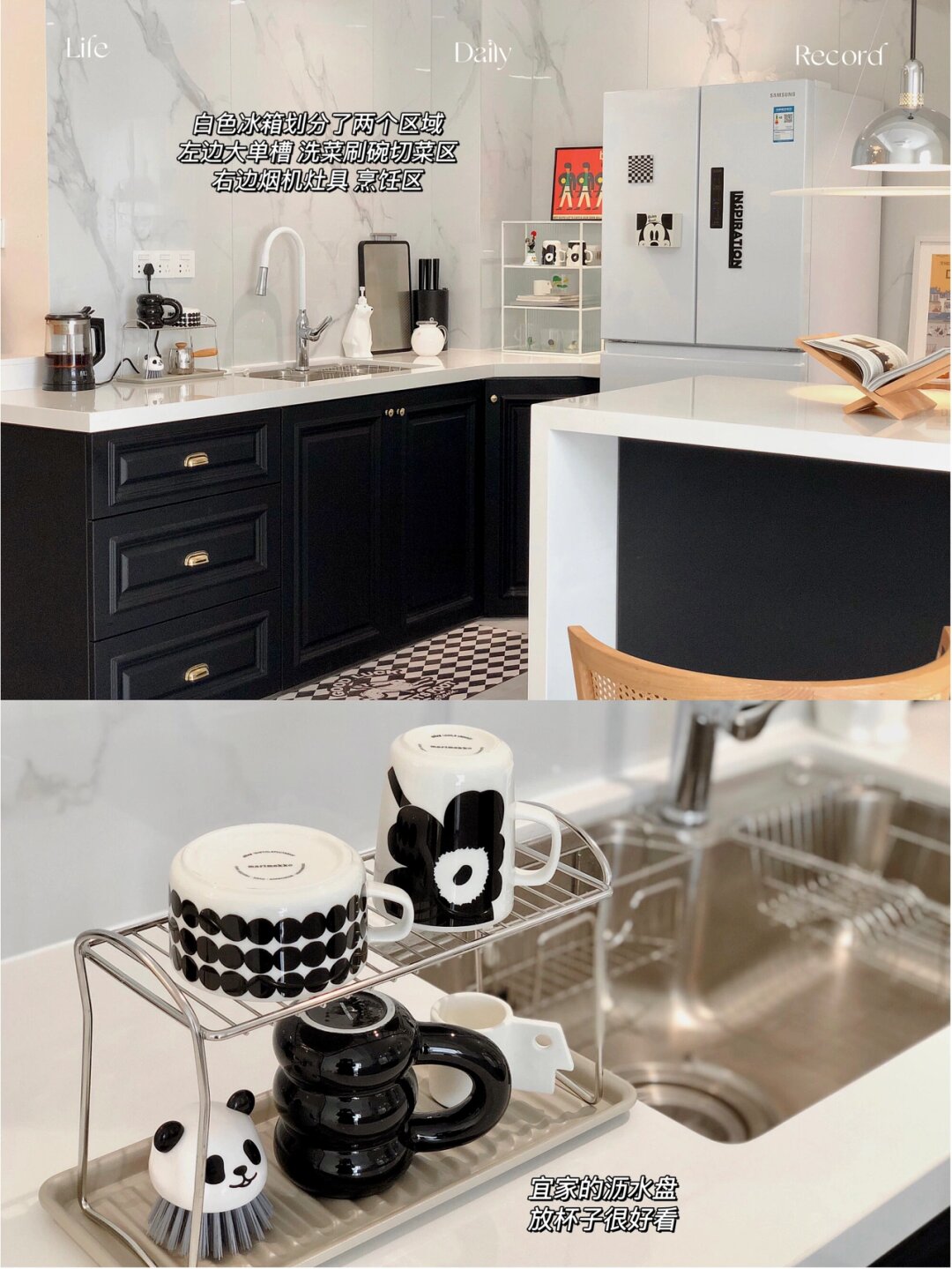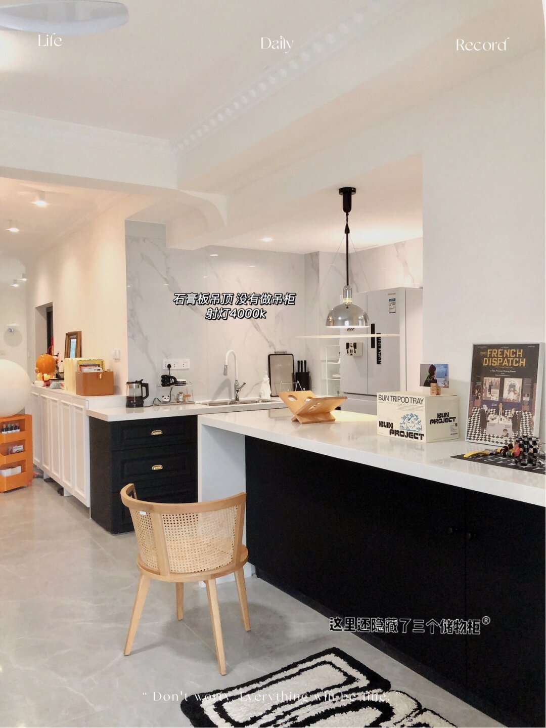 7平米厨房改造每1㎡都是小心机附尺寸 原始格局 厨房是7平米的长方形 岛台区域是之前墙的位置 拆掉了非承重墙 拆分橱柜后 把冰箱也能塞进去了 改造成开放式厨房后空间大了不少 自由度更高 - 地面:灰色柔光砖800*800通铺 更显大 墙面: 1500*750瓷砖 缝隙少也更易清洁 吊顶:防水石膏板 提前预留检修口和油烟机口 射灯+筒灯:5个都是4000K 橱柜:哑光黑色肤感膜 看着很高级 但这清洁确实是个大问题 很容易留下印记和划痕 是真的难擦 选之前也纠结来着 无奈还是败给了颜值[笑哭] 台面:白色石英石 经济实惠还耐用 厚4.5cm 窗:白色百叶窗 免钉安装更方便 - 1洗菜刷碗备菜区 橱柜高度91cm 洗菜刷碗不弯腰 大单槽75*48cm 锅和砧板都能轻松放入 水龙头 选抽拉式的清洗不留卫生死角 冰箱只爱白色 根据预留800mm空间选了好久 尺寸 宽720mm高1875mm厚度694mm 因为没有做吊柜 放进来刚刚好 不影响开关门 - 2烹饪区 橱柜高度86cm 炒菜不累 高度刚好 对于没有做吊柜的厨房 油烟机和灶具的选择应该是厨房电器里的首位重要了~毕竟好不好看 好不好用 都直接影响下厨的好心情和厨房的整洁度~趁活动入手了慧曼整套烟灶 烟机当然要选择顶吸啦 首先是造型我很喜欢 上面可以摆放小物件 装饰和实用都兼具了~而且顶吸的吸力大 拢烟效果也更好 炒菜时挥挥手就能控制开关~用完后启动一下热化油自清洁 更容易清洗 配套的灶具 看起来白净又清透 更好的衬托了锅的颜值 钢化玻璃面板油污一擦就干净了 贴心的防溢保护 为安 全 加分[good] - 3岛台 尺寸是高1m长2.65m 宽84cm 岛台代替了吊柜的储物功能 正面有六个大抽屉 背面还有三个隐藏储物门 让储物空间翻倍 吊灯大圆盘直径60cm 装修前就在看各种灯具 对于岛台的吊灯要求不仅颜值高还需要有更多乐趣 看到铂阑灯堡这款飞碟灯 立马决定就是它了hhh 360度无死角 光影下的氛围感很绝 像停留在半空中的飞碟 很耐看~ - 4水电改造 插座需要多装 大功率的电器需要预留16A的 选择带开关更方便 我这插座还是留少了 - 希望对大家有帮助 会尽量回复[比心]