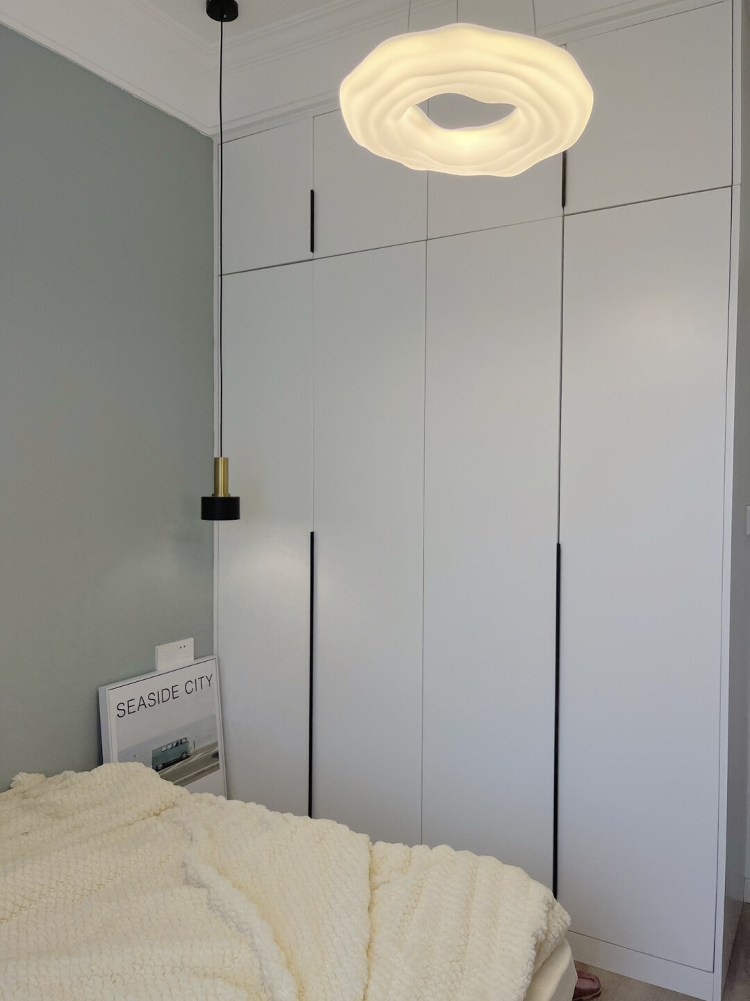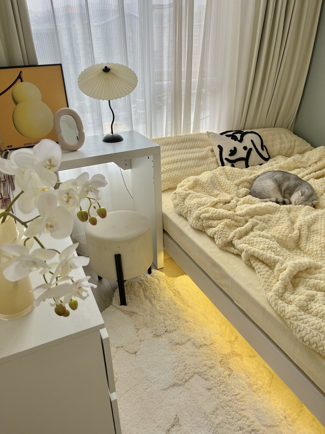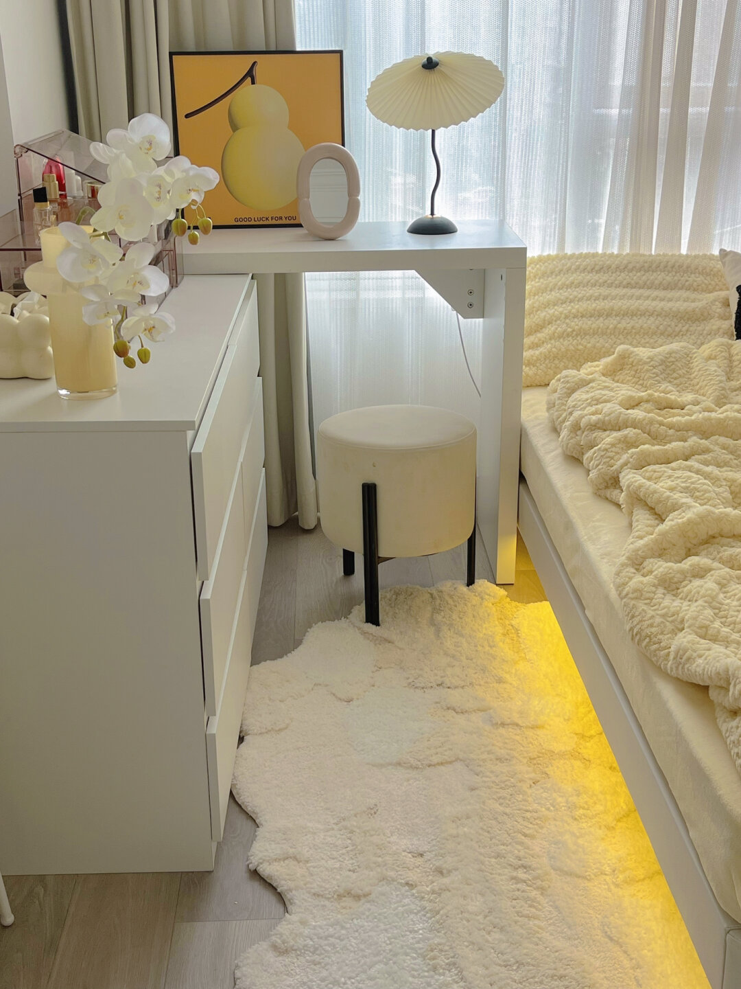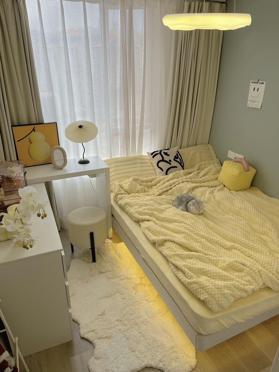 7平米小卧室|改造后真的太实用了! 小卧室布局合理就会满足日常所需的功能 - 衣柜:深度60厘米,长1.7米 斗柜1.2米,桌子1米 L型的摆放特别适合小卧室 - 主灯是选的曲奇吊灯,很喜欢这种暖光 显得卧室很温馨 亮度可以调节也不用担心不够亮 - 床:1.8*2米 我买的实木床架 床底自己安了灯带 开灯就会有种悬浮的感觉 -