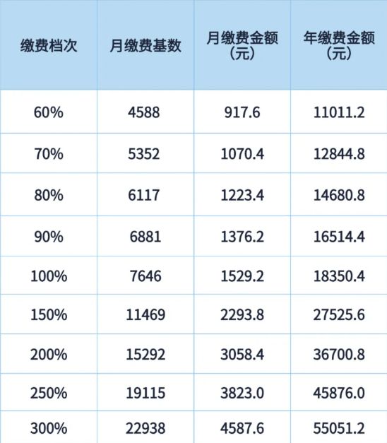 2025年度,全省企业职工基本养老保险月缴费基数上限为22938元/月,下限为4588元/月。资阳市灵活就业人员可在缴费基数上下限之间选择适当的缴费档次,档次及金额详见下表: