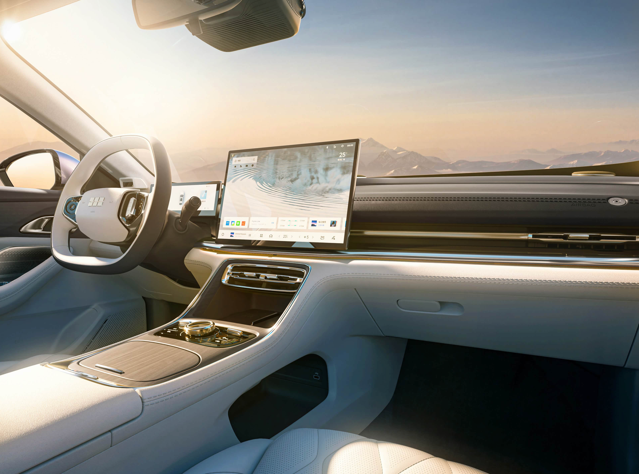 进入车内,吉利银河A7 EV秉承着北欧的高冷范儿和极简设计,也更加符合现代审美需求。大面积环保材质的铺陈,淡雅的杏色主色调,营造出一种清新脱俗的氛围。车顶和地毯的植绒面料,中控台和门板四周的布艺与木纹饰装饰,上下削平的双辐式多功能方向盘采用黑色+米白色的双色双料包裹,操控岛还配备了大尺寸圆形旋钮,别致的空调出风口、杯架以及手机无线充电模块。每一处细节都透露出豪华与品味。科技感方面,吉利银河A7 EV标配了10.2英寸液晶仪表,14.6英寸/15.4英寸中控屏,搭载了银河Flyme Auto智能座舱系统,首发搭载Widget大卡模式,可支持AI智能语音交互,实现四音区语音交互,支持Hicar、Flymelink,ICCOA和Carplay。