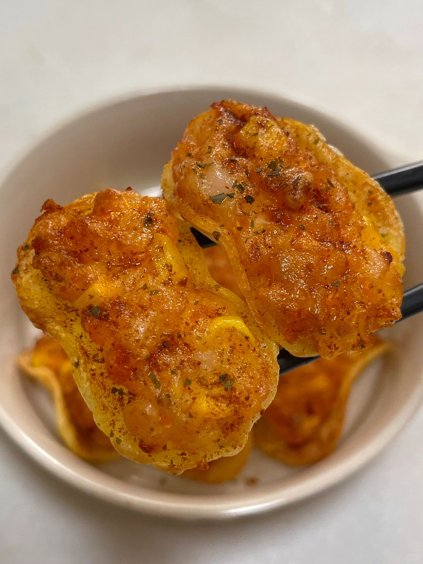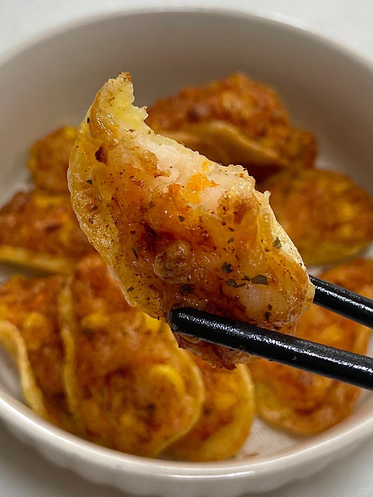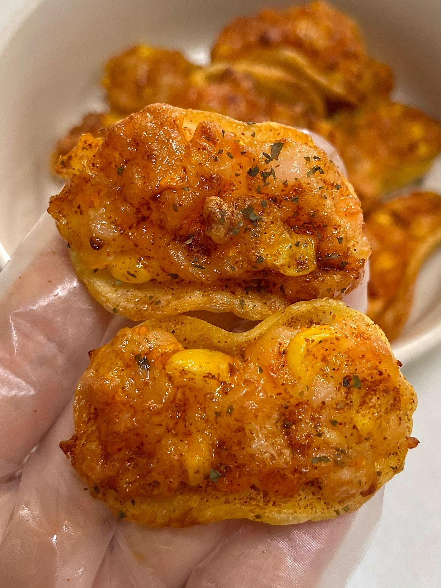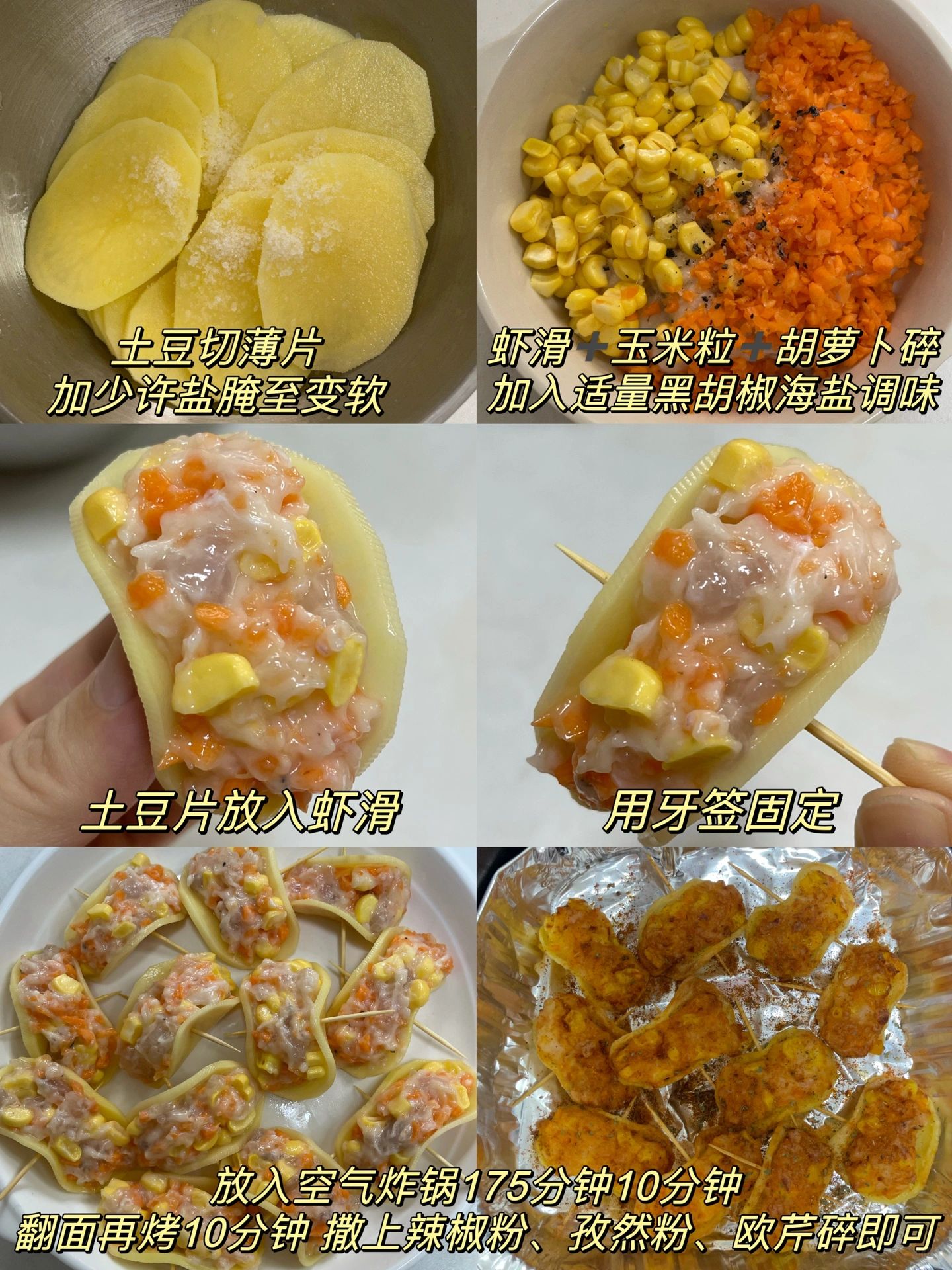土豆虾滑卷!! 鲜甜的玉米 Q弹的虾滑 焦脆的土豆 一口一个真的泰香了! 好吃又简单!赶紧去试试~ ☑️土豆切薄片 加盐腌软 ☑️虾滑➕玉米粒➕胡萝卜碎 加入海盐黑胡椒搅匀 ☑️土豆里面塞入虾滑 用牙签固定 ☑️空气炸锅175度20分钟 中间翻面一次 出锅撒辣椒粉、孜然粉、欧芹碎