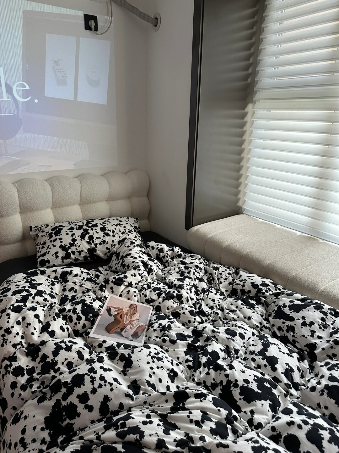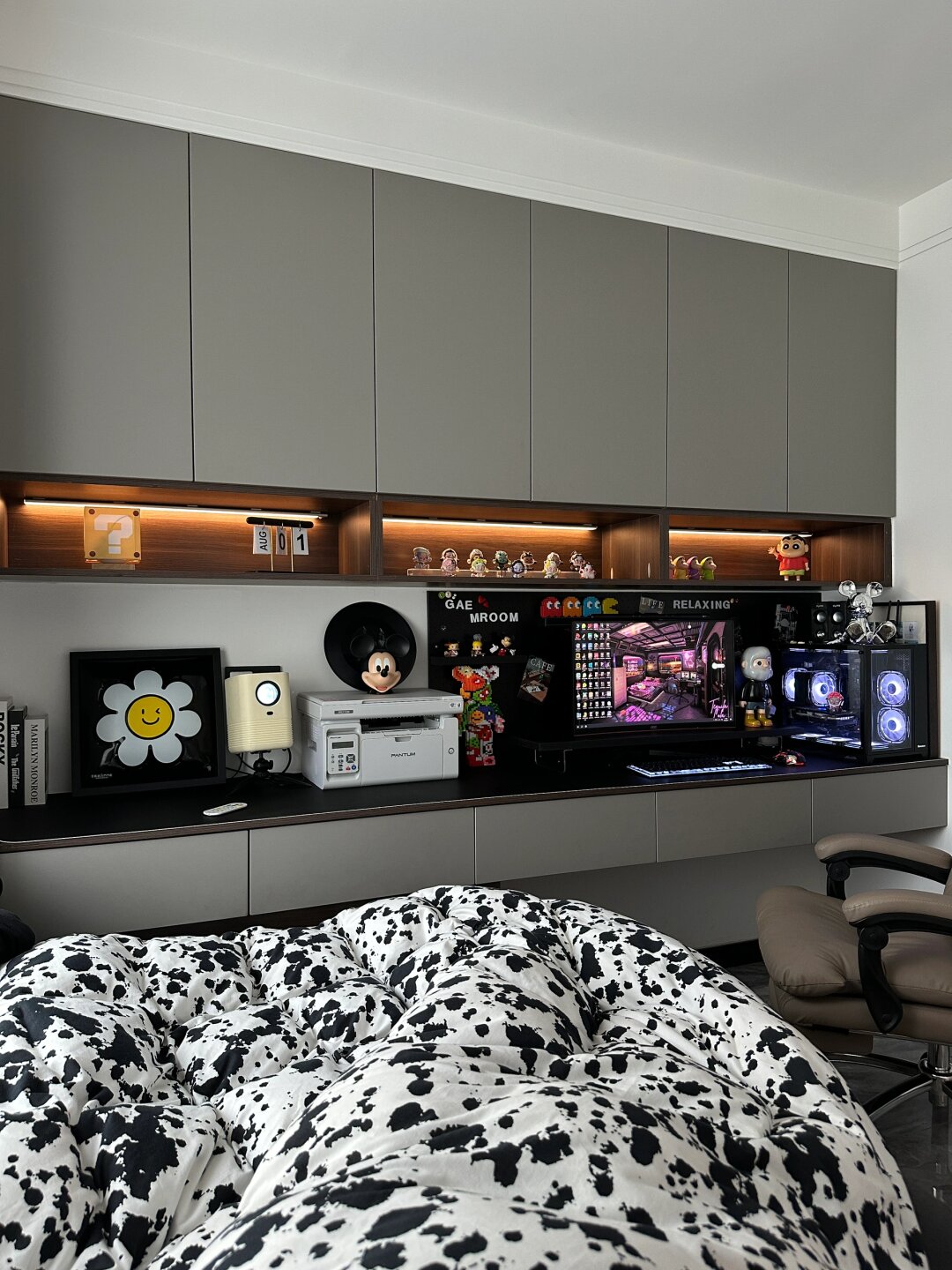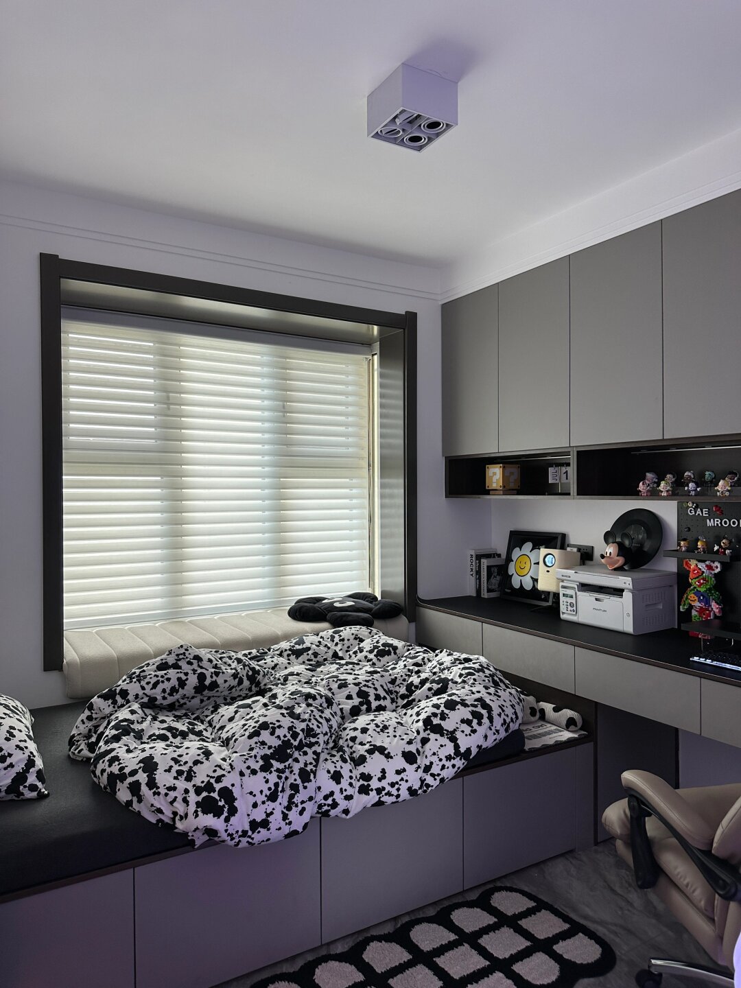 8㎡榻榻米改造成电竞房,我真的太喜欢了 卧室面积只有8平 装修时还曾迷茫这个巴掌大的地儿要怎么设计… 结果还是做成了千篇一律的榻榻米 后期又在基础上把书桌改造了电竞区 就变成现在的兼卧室、书房、电竞房于一体的多功能卧室了 因为空间很小嘛,全屋刷的大白墙 这样空间看上去更宽敞 吊顶做的简约边吊,搭配斗胆灯 不压层高,灯光氛围也很好~ 床和吊柜全屋都是自己买板材找木工打的 1.2米的单人床和吊柜长桌是一体的 没有衣柜,床下和吊柜都带储物空间 把飘窗铺上飘窗垫当做休闲区,平时可以晒晒太阳看看书~ 长桌一分为二,一半是有游戏工作两不误的电竞区域 另一半以后宝宝可以当书桌用…… 自由活动的空间放一把椅子,床边搭配个彩虹镜跟电竞房也很搭 虽然空间小,但是空间利用的井然有序,该有的都有 不上班宅家的日子就喜欢一个人待在这里独处 把该忙的工作整理完,追追剧,看看书 累了就在床上小憩一会 这样的生活状态真的很喜欢~