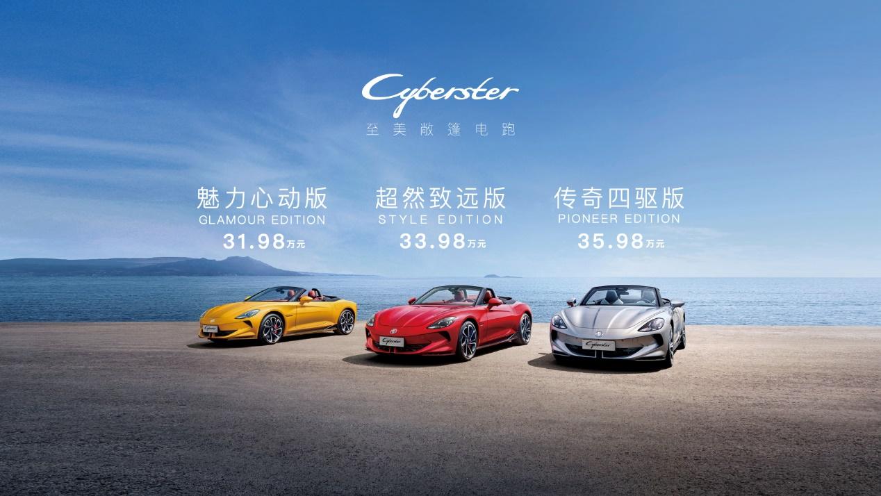中国人造的电动敞篷跑车MG Cyberster于2023年广州车展上市 11月17日,敞篷电动跑车MG Cyberster在广州车展正式上市,新车共有三个配置,MG Cyberster传奇四驱版35.98万元、超然致远版33.98万元、魅力心动版31.98万元。此外,MG官方还提供包括取送车服务及交车礼包在内的上市权益与“里程自由”礼、“财务自由”礼、“续航自由”礼、“流量自由”礼四大尊享权益。 自MG Cyberster开启预定通道以来,短短50天就收到了超过1000张定单,这样的成绩已然跻身30万以上价位跑车市场的第一阵营。此外,Cyberster也将实现“上市即交付”,用户最快今天即可提车。 与此同时,MG Cyberster传奇四驱红篷版也在车展期间首度惊艳亮相,该车以摩登米和红篷为色彩基调。该车型将于2024年3月开启预定。 MG Cyberster的底盘由前F1冠军车队底盘动态工程师Marco Fainello亲手调校,将整车驾控性能带到全新高度;四驱版高达544Ps的澎湃动力,3.2s即可加速破百,动力强劲;Brembo四活塞固定式卡钳搭配德国Continental制动系统,提供33米顶级制动表现。 与此同时,MG Cyberster面对智能化发展大势,搭载了L2+级智能驾驶辅助系统,在ACC自适应巡航、ICA智能巡航辅助、RPA遥控泊车等功能的支持下,让驾驶员开跑车跑长途和入库停车也能轻轻松松。而针对驾乘人员看重的车内氛围,Cyberster采用斑马智能座舱·Cyber OS系统,配合高性能游戏引擎Unreal Engine及高通骁龙8155车规级芯片,带来行业领先的3D化沉浸式交互,结合三联屏环抱式设计和BOSE音响系统,感官体验也更上一层楼。 作为MG品牌的第二款全球车,同时也是MG为迎接新百年打造的献礼之作,MG Cyberster在中国首发后,预计明年年中还将在英国等欧洲主要市场陆续上市,让世界一睹中国跑车的风采。【来自懂车帝车友圈】
