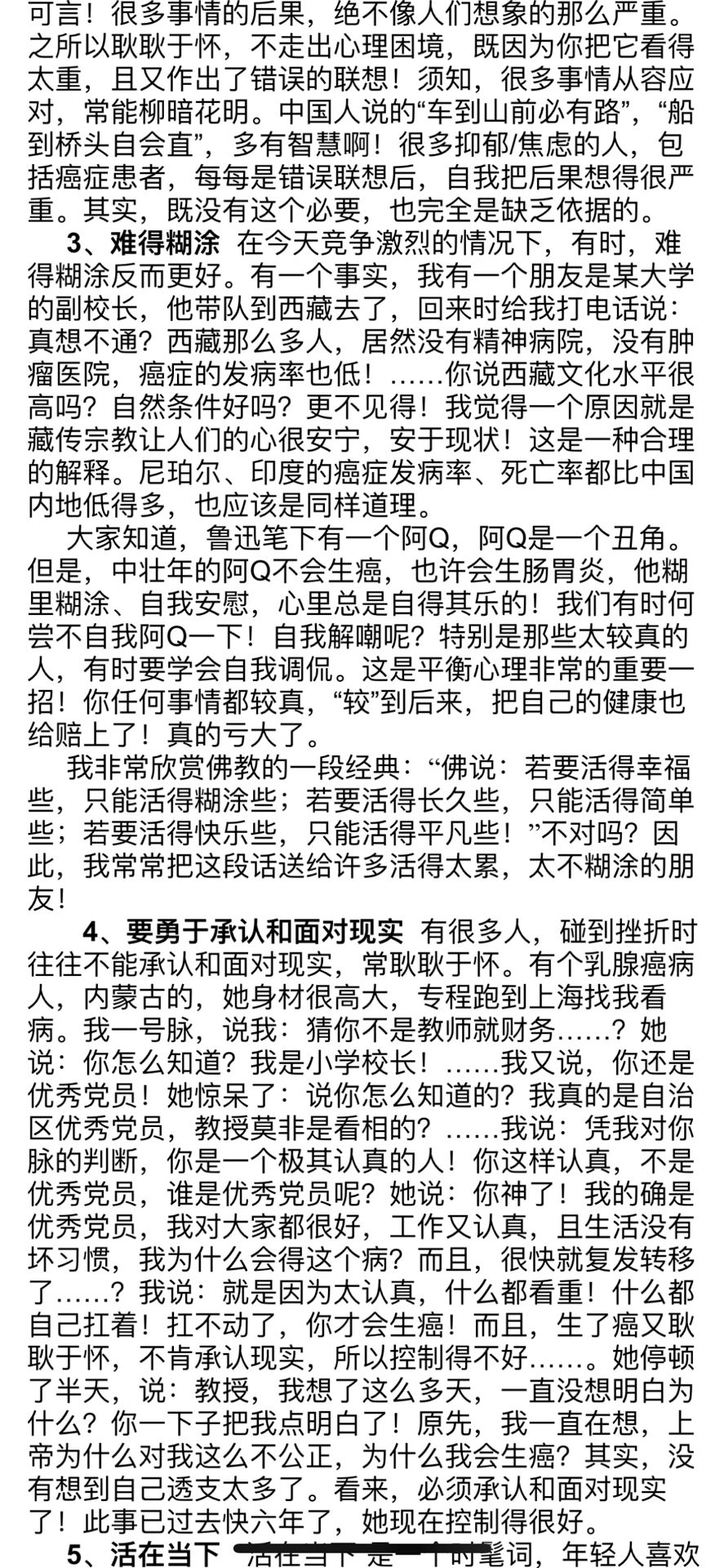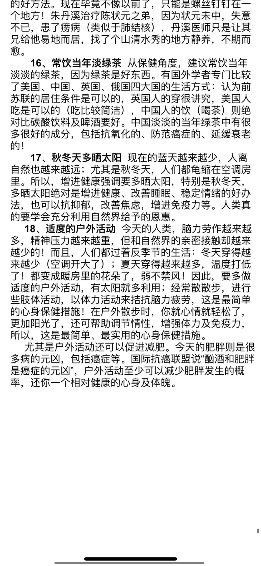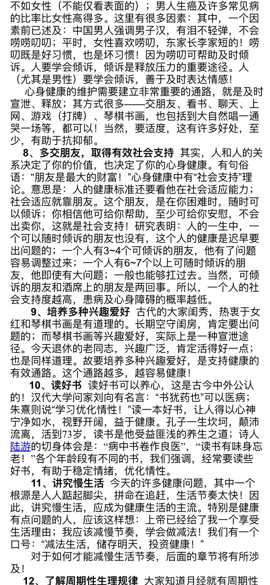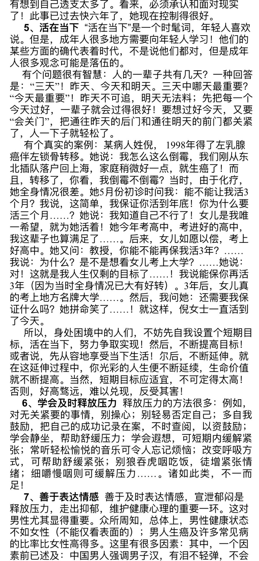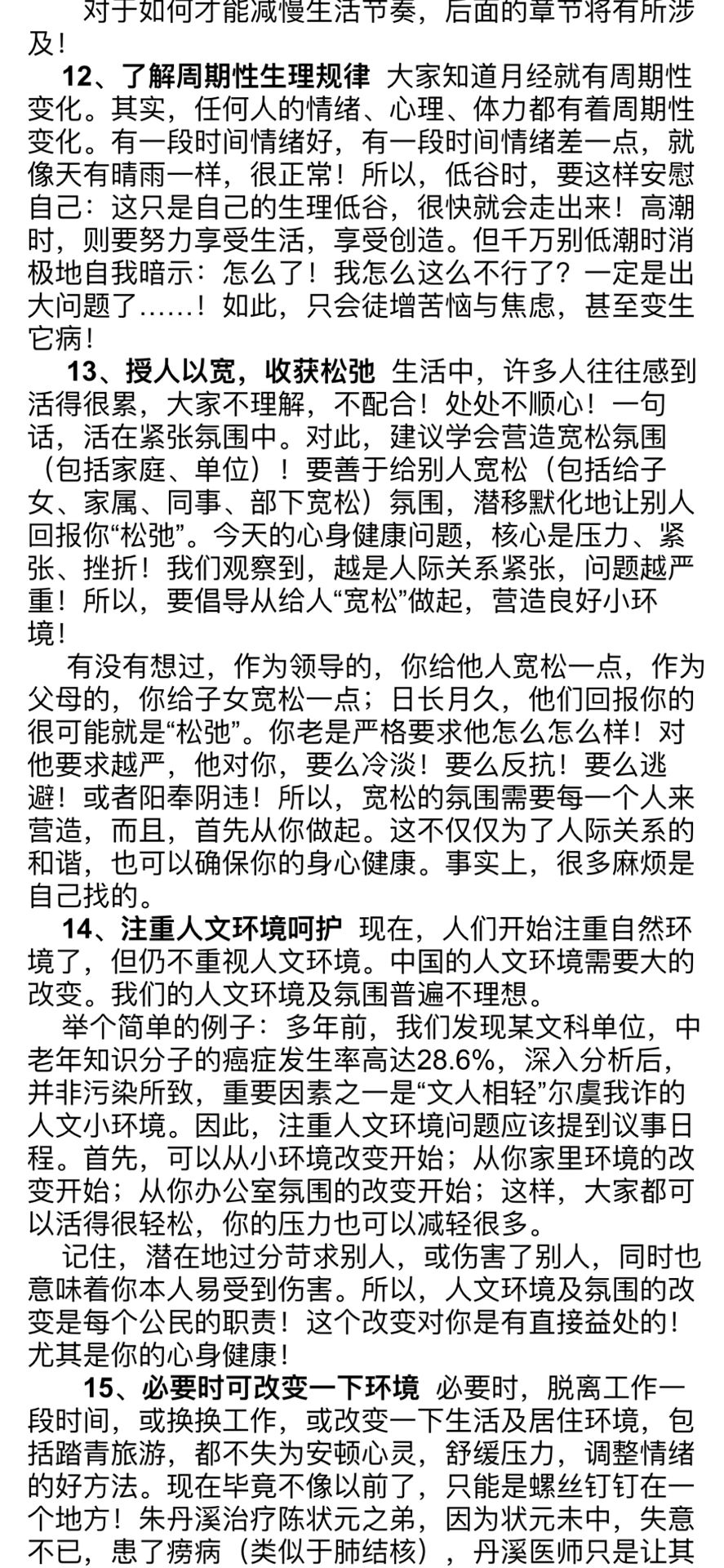 何裕民教授的金玉良言: 1、换一种方法思考 2、不做无谓的联想 3、难得糊涂 4、要勇于承认和面对现实 5、活在当下 6、学会及时释放压力 7、善于表达情感 8、多交朋友,取得有效社会支持 9、培养多种兴趣爱好 10、读好书 11、讲究慢生活 12、了解周期性生理规律 13、授人以宽,收获松弛 14、注重人文环境呵护 15、必要时改变一下环境 16、常饮当年绿茶 17、秋冬天多晒太阳 18、适度的户外运动 让我们一起远离身体及情绪上的疾病~