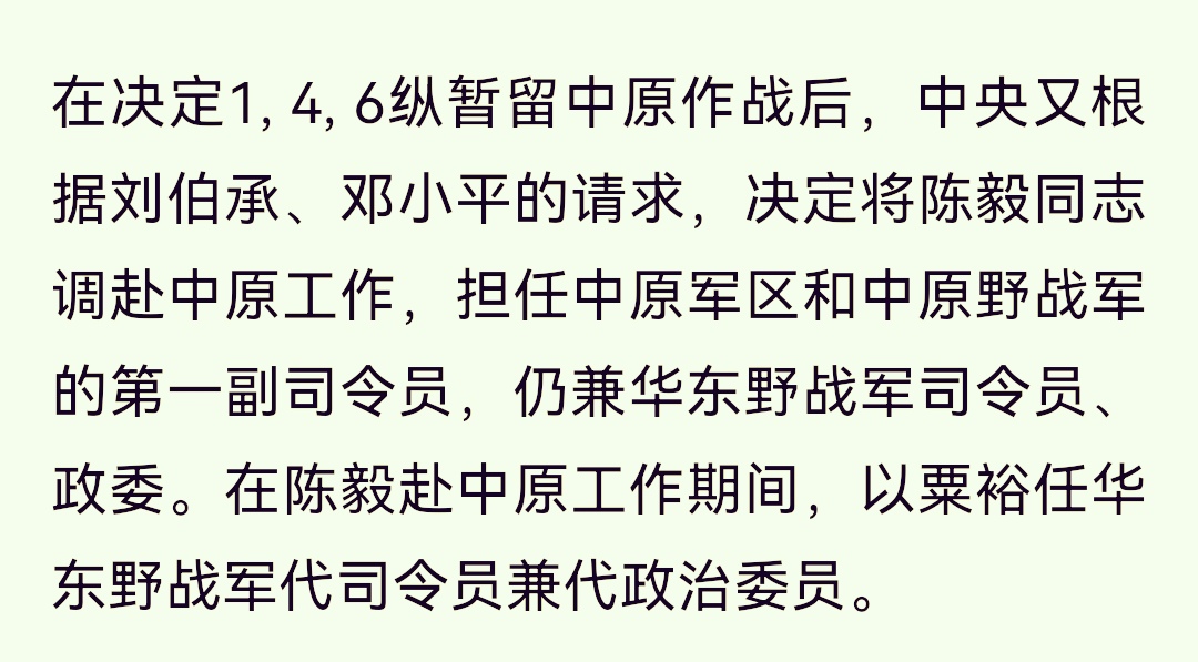 为了实现中央、中央军委关于刘邓、陈粟、陈谢三路大军呈“品”字形共同“经略中原”的战略方针,华东局三员大将调任中原局。