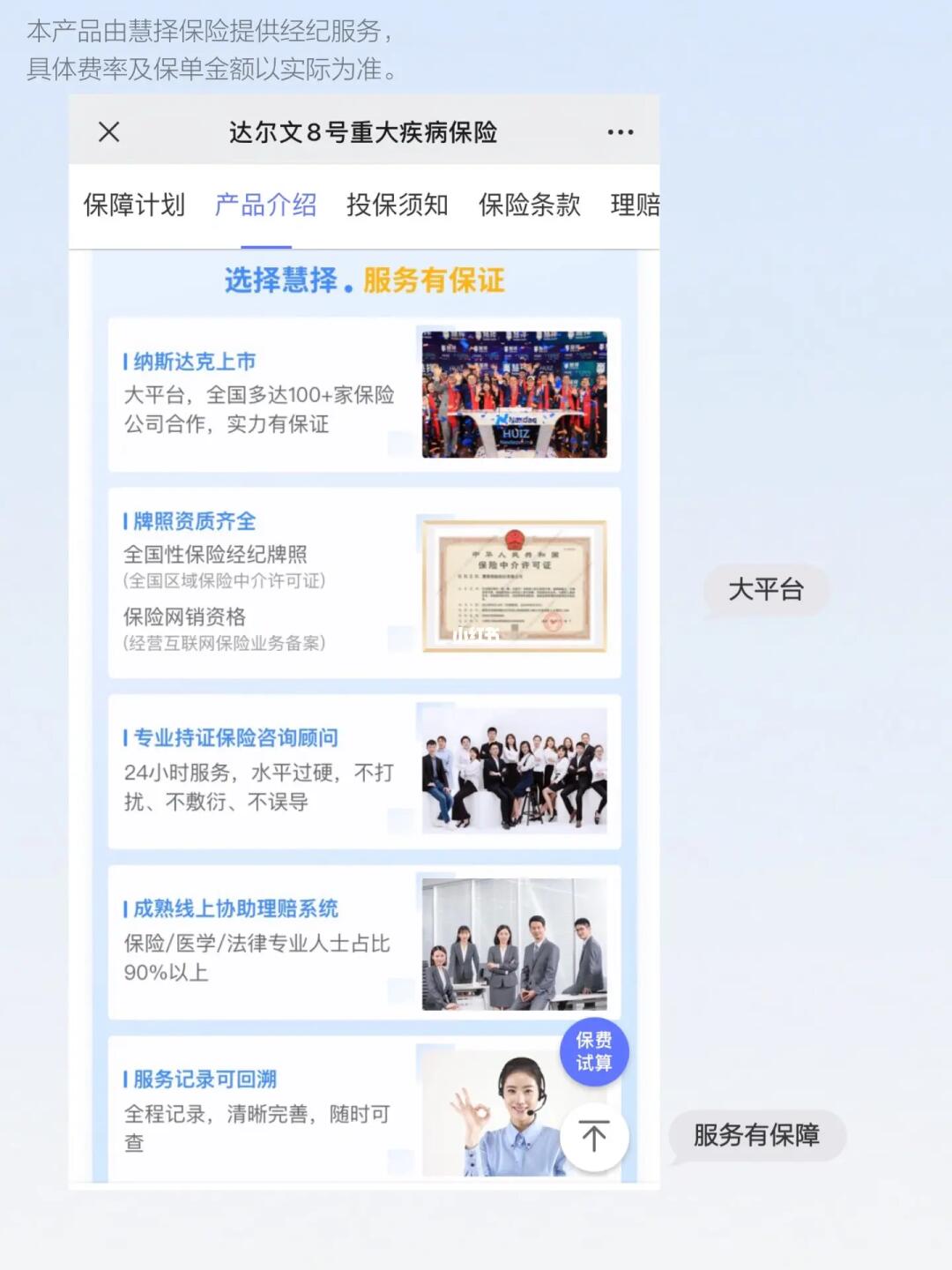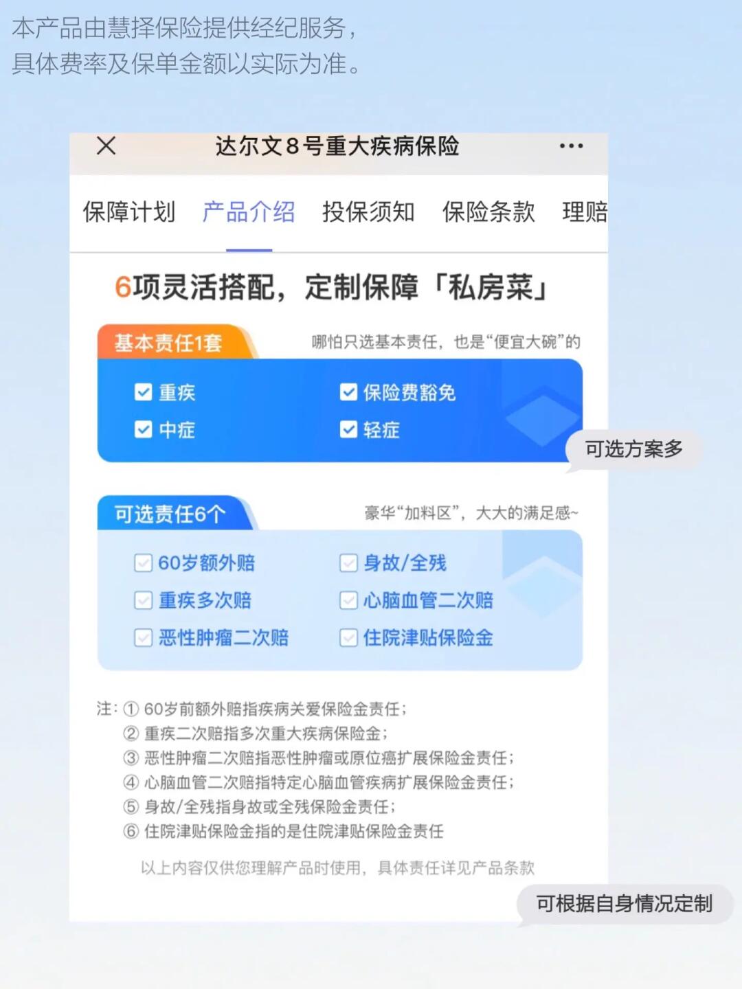 ☘️刚好有个朋友从事保险行业,在她的推荐下,选了性价比比较高的慧择达尔文8号。为什么说性价比高呢?因为它比普遍的重疾险保费低,且不是大病也有机会赔。而且大平台也不用担心保障问题。