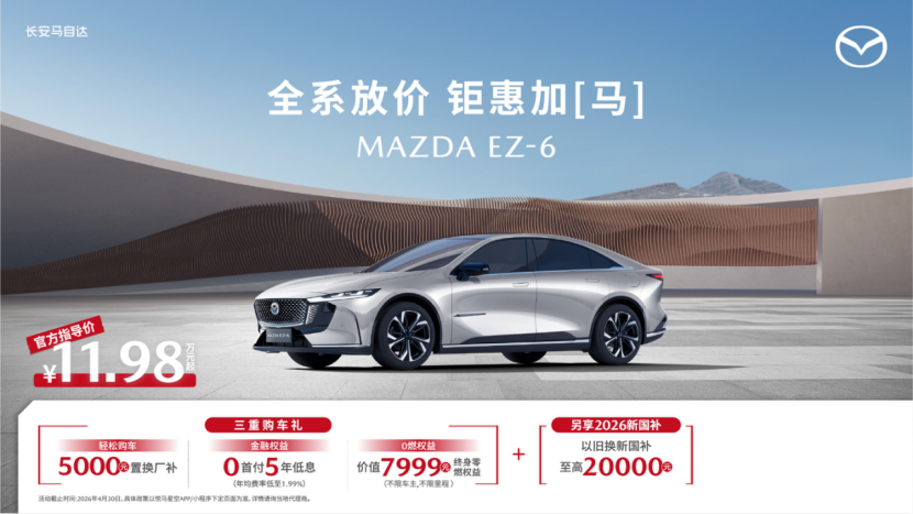 长安马自达的春日福利覆盖全系。钟情轿跑风范与全球顶级安全的用户,MAZDA EZ-6是绝佳选择。它拥有斩获7项国际大奖的魂动设计,以及中美欧五星安全认证,起售价11.98万,可享5,000元置换补贴加至高20,000元国补,综合优惠25,000元。
