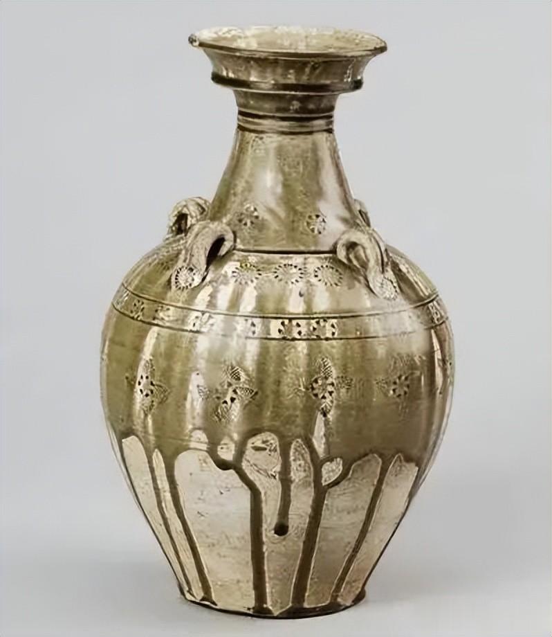 隋代寿州窑青釉四系盘口壶,1977年凤阳临淮出土,口径12厘米,底径11.8厘米,高35厘米。盘口,长颈,鼓腹下敛,平底。肩部有四个桥形竖纽。壶身有模印草叶纹四层。通体施青釉至下腹部,釉色透明,并有细小开片,腹下部有流釉20多处。