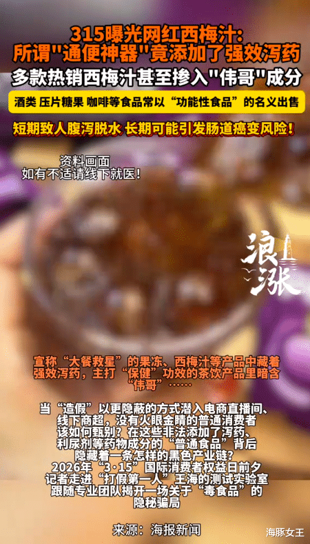 网红西梅汁竟然添加泻药,多款热销西梅汁甚至添加“伟哥”成分。