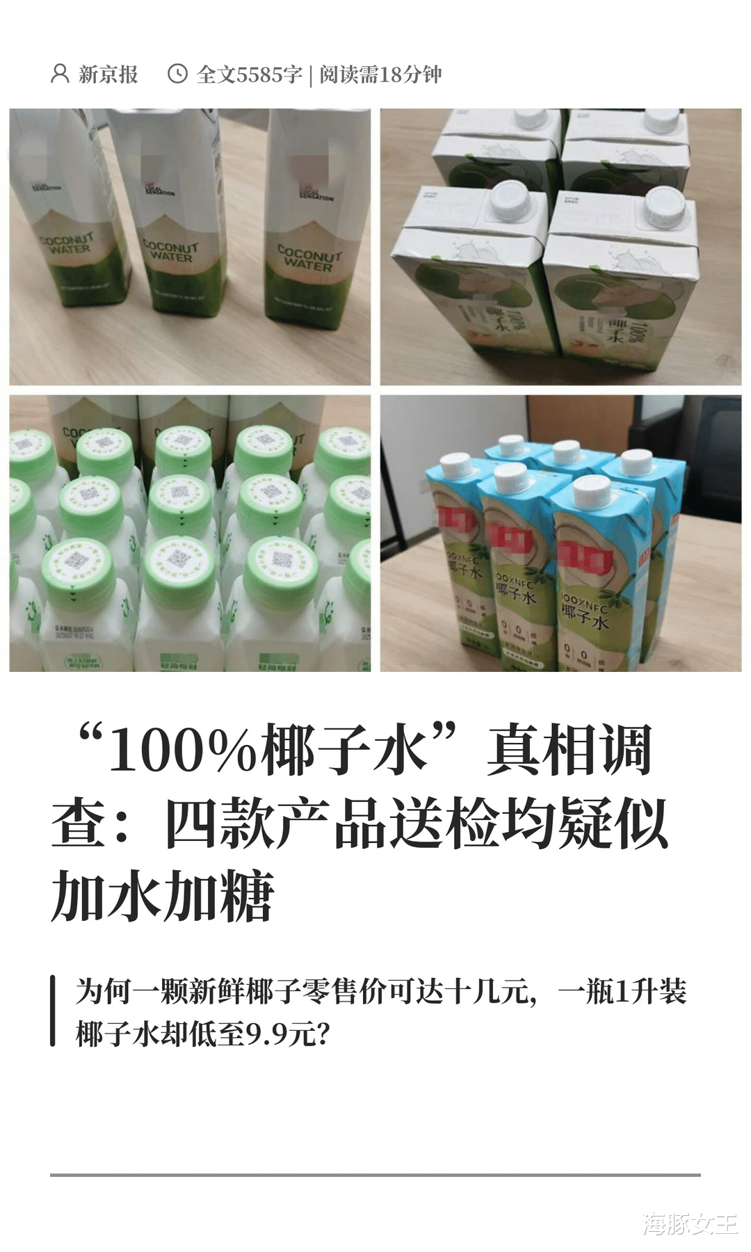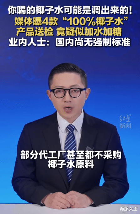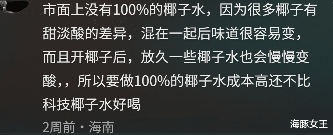 有一个海南的网友说的很有道理,他说市场上没有100%的椰子水,因为每个椰子不同,口味有的偏甜,有的偏淡酸,混合在一起很容易变味,想做100%椰子水不仅成本高,而且不好喝,商家肯定会选择科技椰子水。