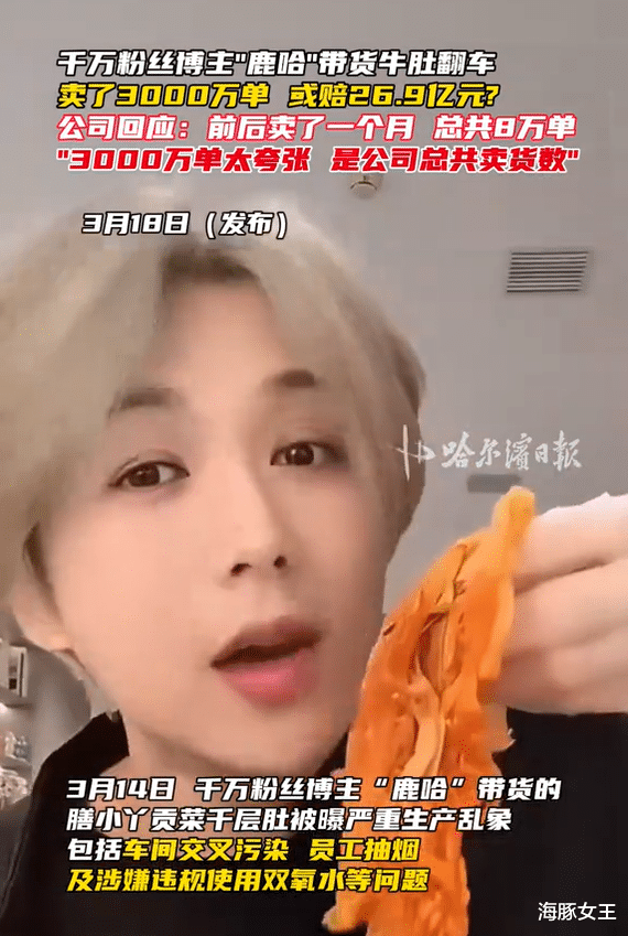 不过鹿哈公司的负责人否认他们卖毛肚3000万单,毛肚只是卖了8万单,3000万单是总的产品销售量,而且他们前后才卖了一个月。