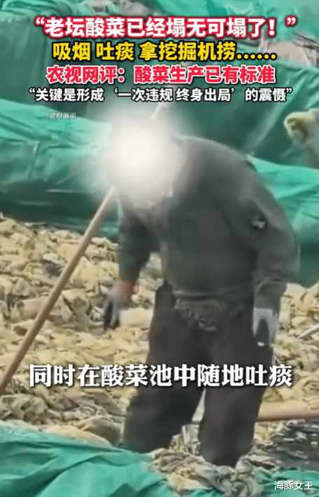 工人一边叼着香烟,对酸菜进行足时发酵,一边“噗”的一声,往酸菜中加点白的,绿的,黄的老痰,感冒的工人还会时不时甩出洒水车一般的鼻涕。