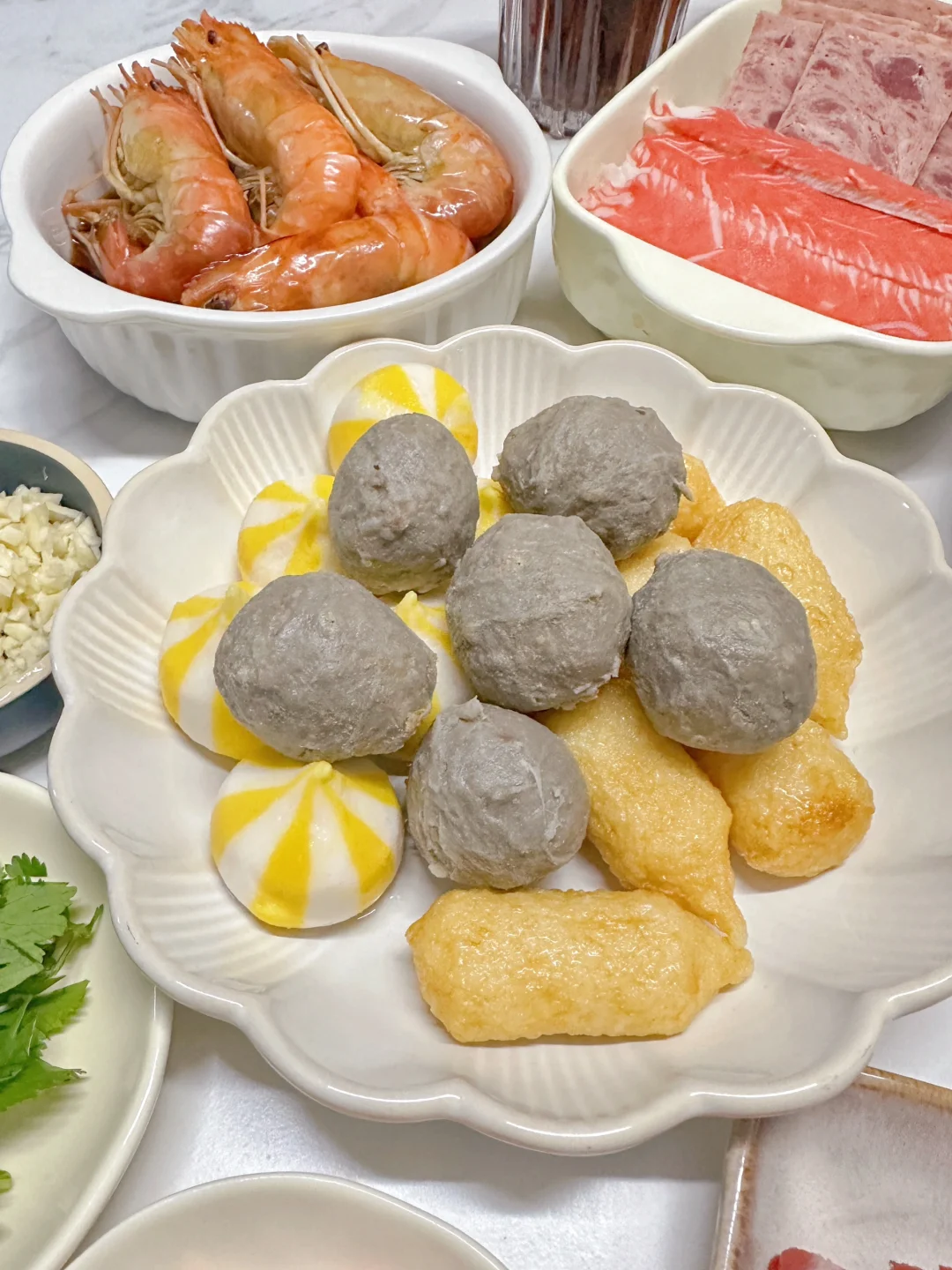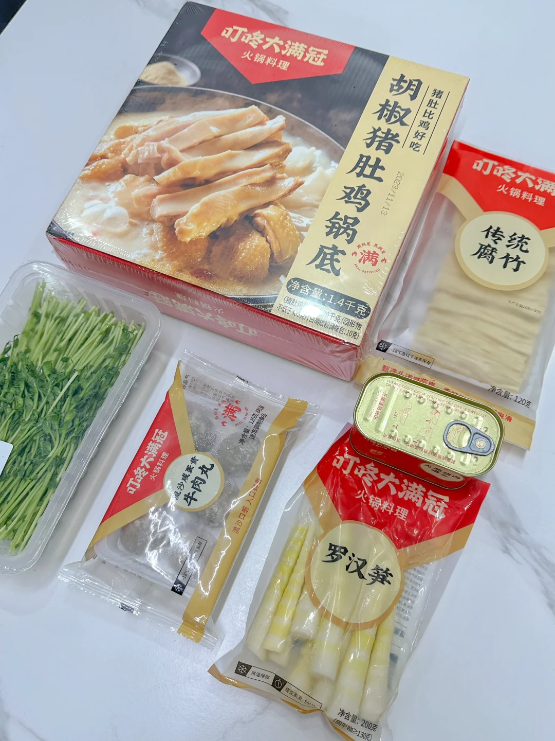 肥牛卷,鱼籽包,黄金起司条,咸蛋黄牛肉丸,午餐肉,腐竹,罗汉笋,平菇,香菇,金针菇,豌豆苗,白菜,香菜