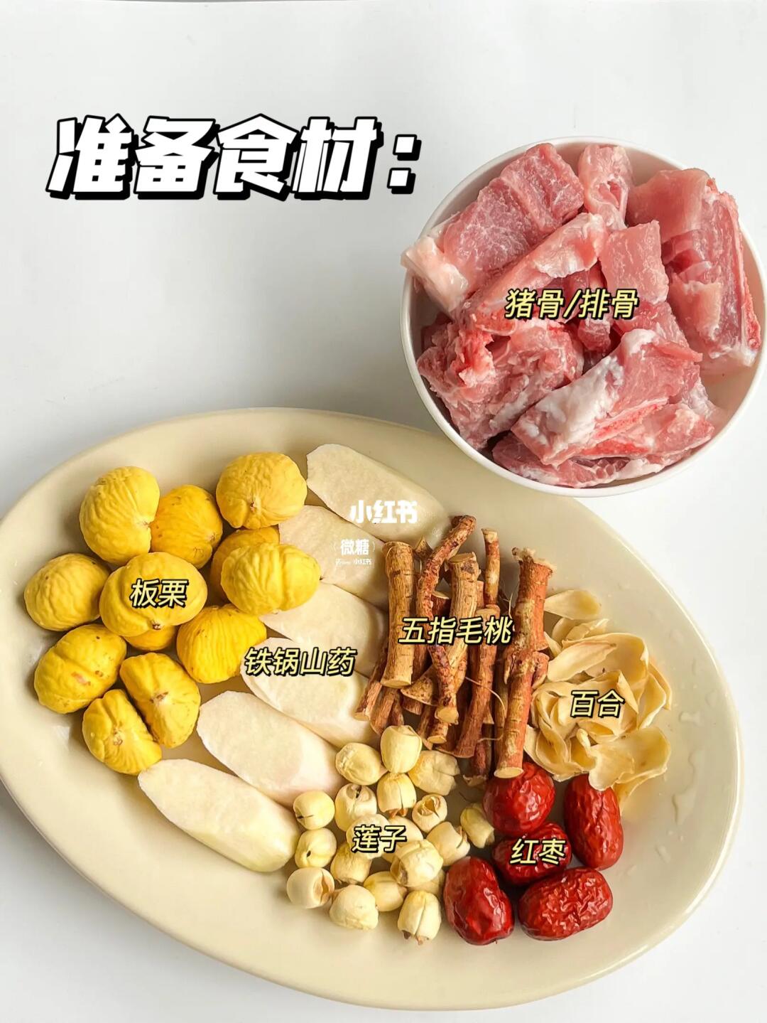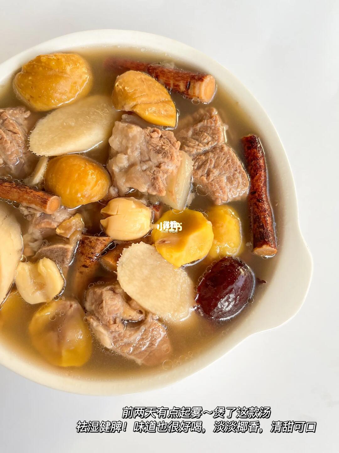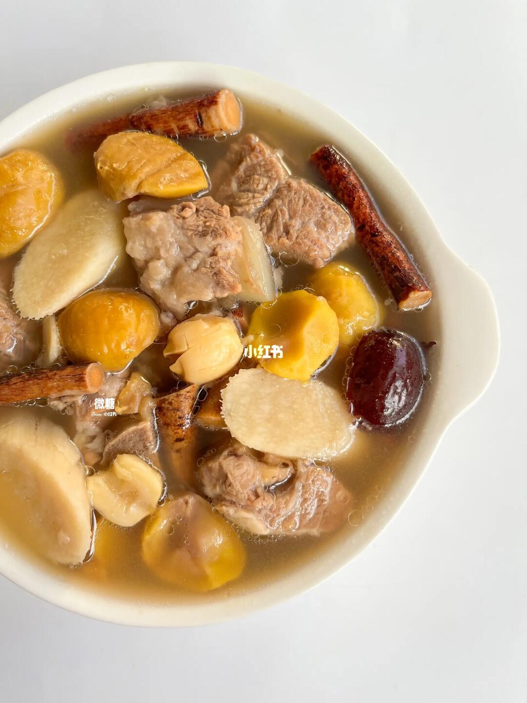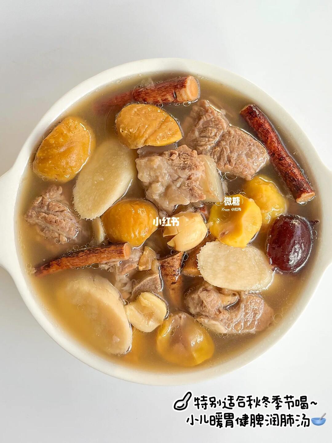 秋冬养生汤来咯~今天煲的是五指毛桃板栗猪骨汤🥣淡淡的椰香味~鲜美清甜,小朋友都很喜欢喝😋幼儿园门口接孩子放学,有些小朋友一到秋冬都咳嗽声不断😰给孩子脾肺养好了,就不容易生病,这款汤很适合全家一起喝👌🏻 ⭕️准备食材: 猪骨,板栗,五指毛桃,铁锅山药,莲子,百合,红枣 👩🏻🍳做法: 1️⃣猪骨先焯水,焯好水后加入锅内 2️⃣所有药材加入锅内,再注入适量的清水,先煲30分钟 3️⃣再加入板栗和山药,一起再煲20分钟 4️⃣最后加点盐即可✅