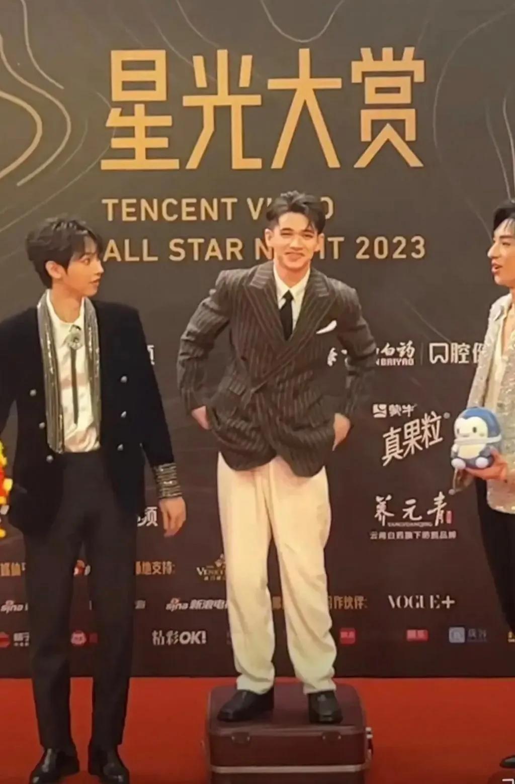 星光大赏出现比较奇葩的一幕,一位男星拎着箱子走红毯,到拍照的时候,直接站了上去,原来是觉得自己矮,自带的增高箱,确实挺好笑的!不过挺好的,用一种幽默的方式正面承认自己的短板,比踩着厚底让“敌”我双方粉丝议论混战要好多了。#盘点明星那点事# #看见人间百态#