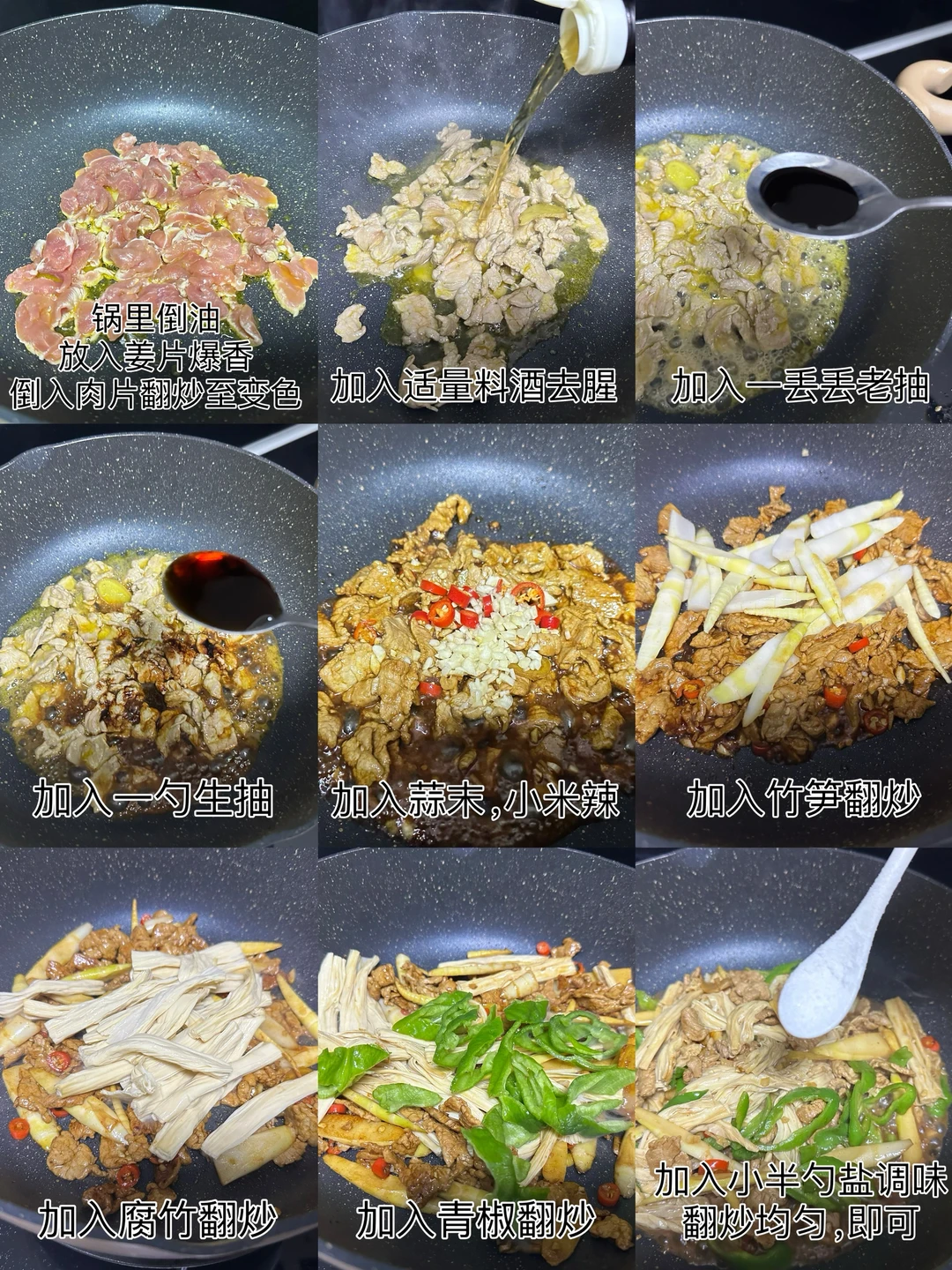 食材:腐竹 肉片 竹笋 青椒 大蒜 生姜 小米辣