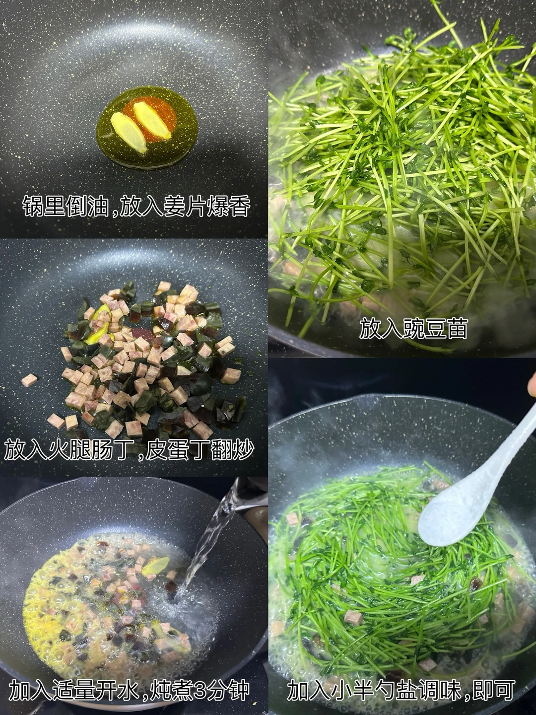 食材:火腿肠 皮蛋 豌豆苗 生姜