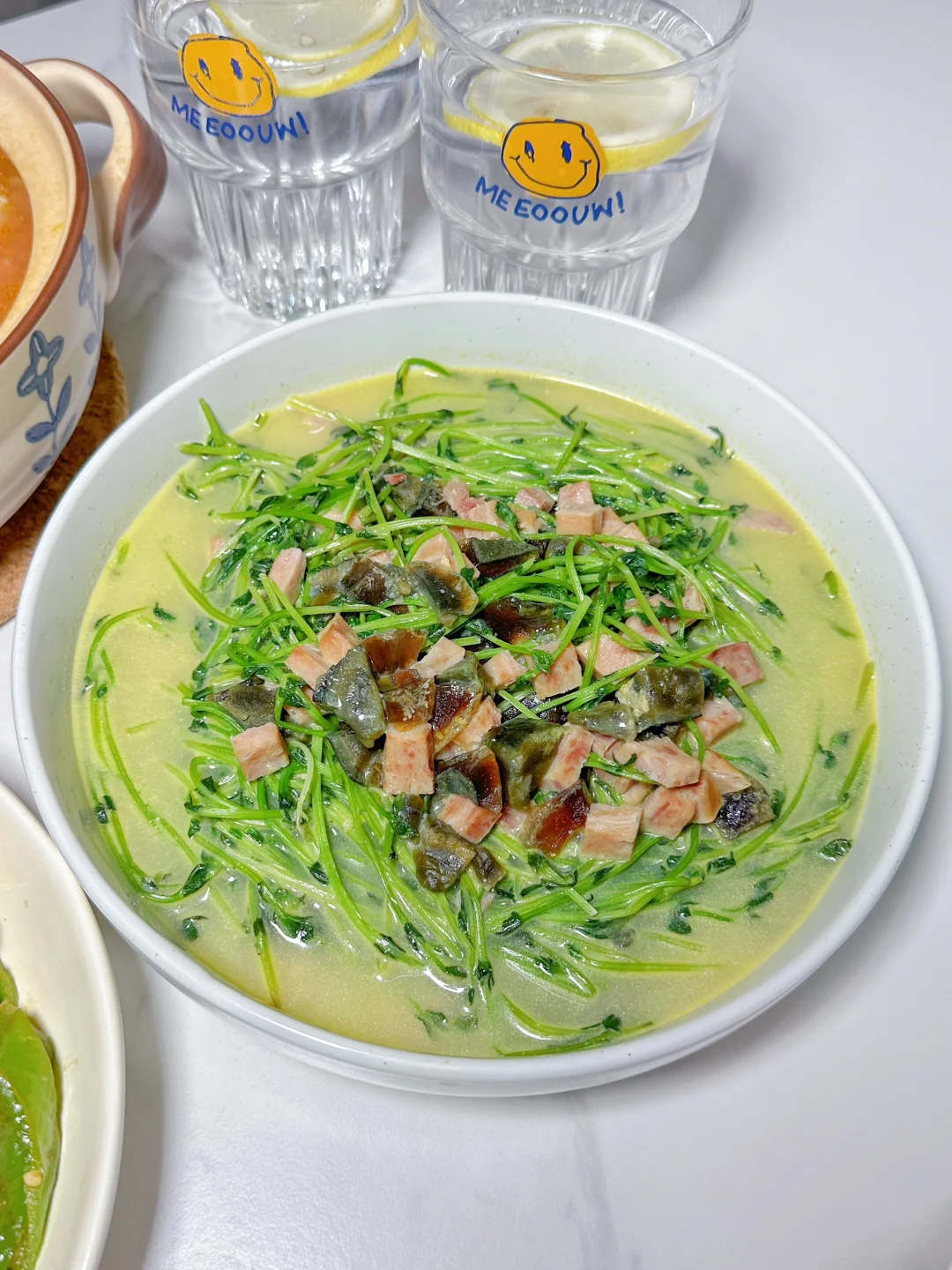 2️⃣加入豌豆苗,煮开,加入小半勺盐调味,即可