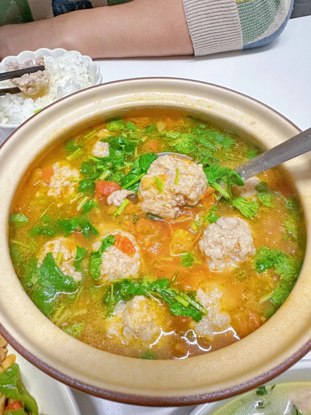4️⃣肉末搓成小丸子,依次放入砂锅中,小火炖煮20分钟,加入一小勺盐调味,最后撒上香菜,即可