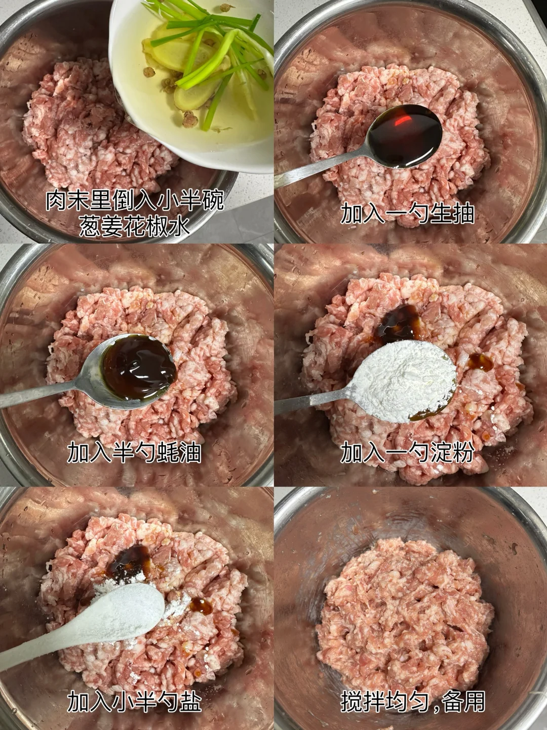 2️⃣肉末放入容器中,倒入葱姜花椒水,加入一勺生抽,半勺蚝油,一勺淀粉,小半勺盐,搅拌均匀备用