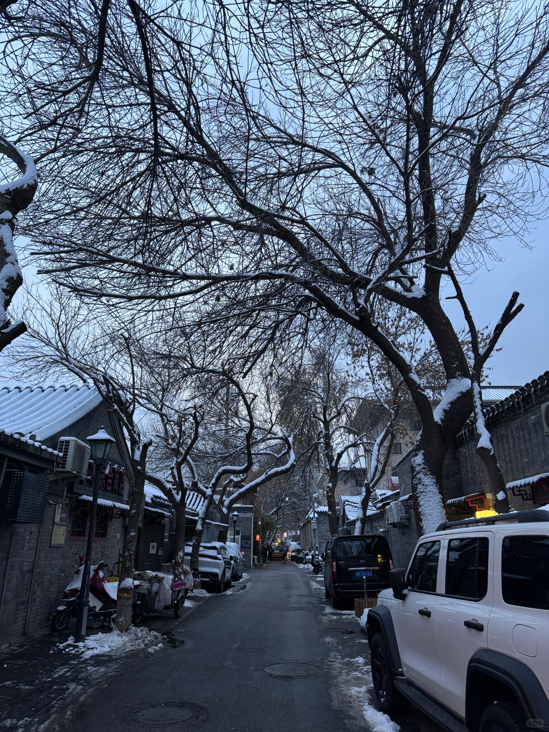 好运赶上了北京的初雪❄️ 第二天慕名而来打卡的一家宝藏店 从来没有体验过的北京四合院特色 前一晚北京初雪❄️ 天色暗暗的 路边院子里都是积雪 提前预定的玻璃房 点了一壶秋梨🍐白茶和两份可爱的甜点🍮 老板很热情的送了他们自制的糖葫芦 在自带暖气的温暖玻璃房里 有点可惜的是没法在玻璃房里用炭炉煮茶 电茶壶咕噜咕噜的冒着热气 喝一口暖暖的 欣赏着四合院的雪景 院里还有两只可爱的猫猫 白色的长毛的那只特别活泼 这场景舒服的都快睡着了~ 📍:北锣鼓巷91号 🅿️:建议打车来 在巷子里 停车有点难