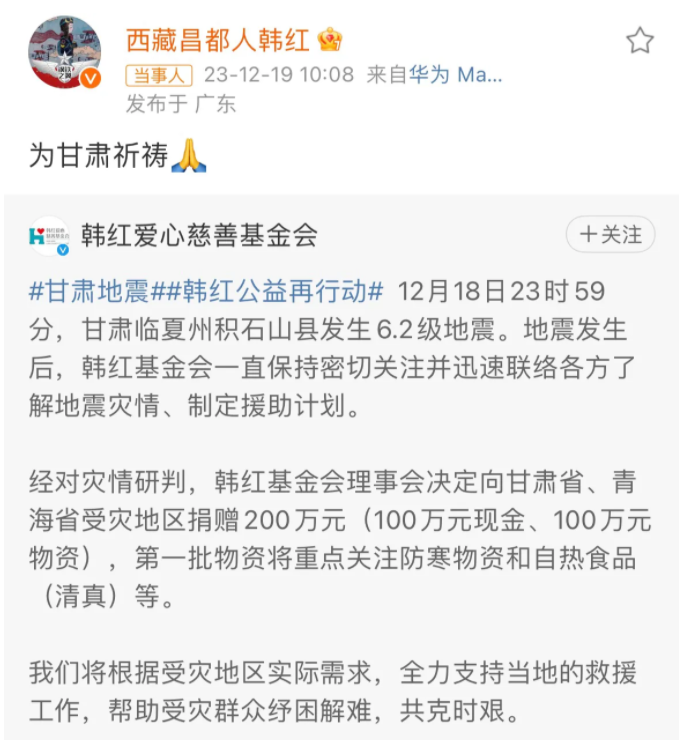 知名歌手韩红在看到甘肃地震的消息后,第一时间捐款捐物,向甘肃和青海捐赠了200万元,包括100万元现金和100万元物资。