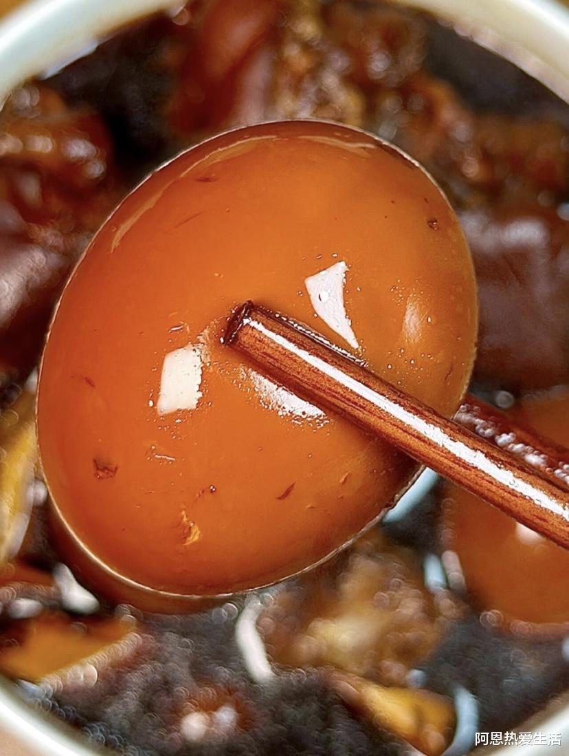 在炖猪脚的同时,将鸡蛋冷水下锅煮熟,捞出过凉水,轻松剥壳。在猪脚炖了1小时后,将白嫩光滑的鸡蛋放入锅中,继续盖上盖子,再慢炖1小时。
