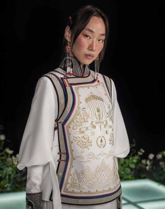 设计灵感深植于元代关外蒙古族的传统服饰之中,礼仪服上,九面白旗迎风招展,奥运火炬与巴黎奥运会会徽交相辉映,所有图案均以璀璨金线细腻刺绣,不仅彰显出蒙古民族独有的豪迈与神秘气质,更是一次对悠久蒙古文化的崇高致敬。