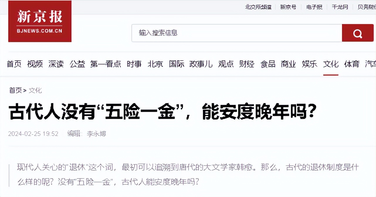 3、原文刊登于新京报2024-02-25发布的关于《古代人没有“五险一金”,能安度晚年吗?》的报道;