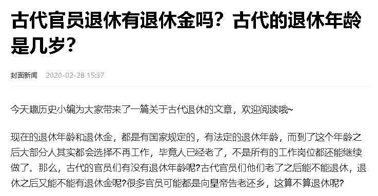 1、原文刊登于封面新闻2020-02-28发布的关于《古代官员退休有退休金吗?古代的退休年龄是几岁?》的报道;