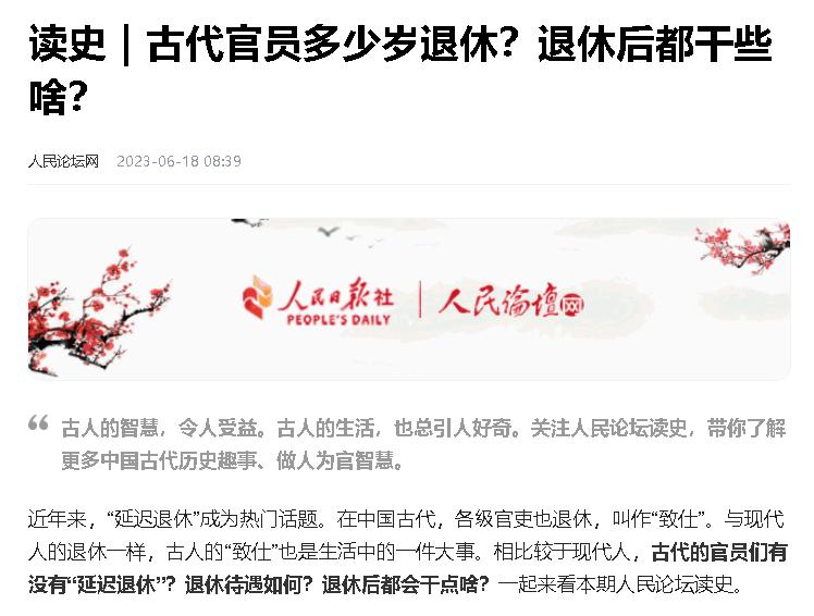 2、原文刊登于人民论坛网2023-06-18发布的关于《读史|古代官员多少岁退休?退休后都干些啥?》的报道;