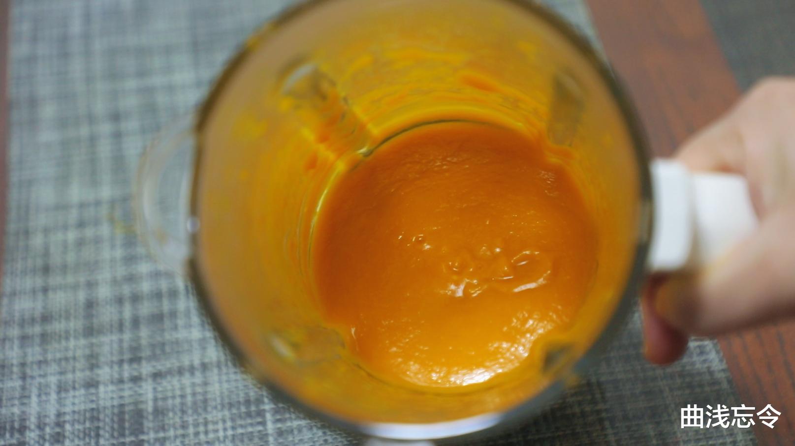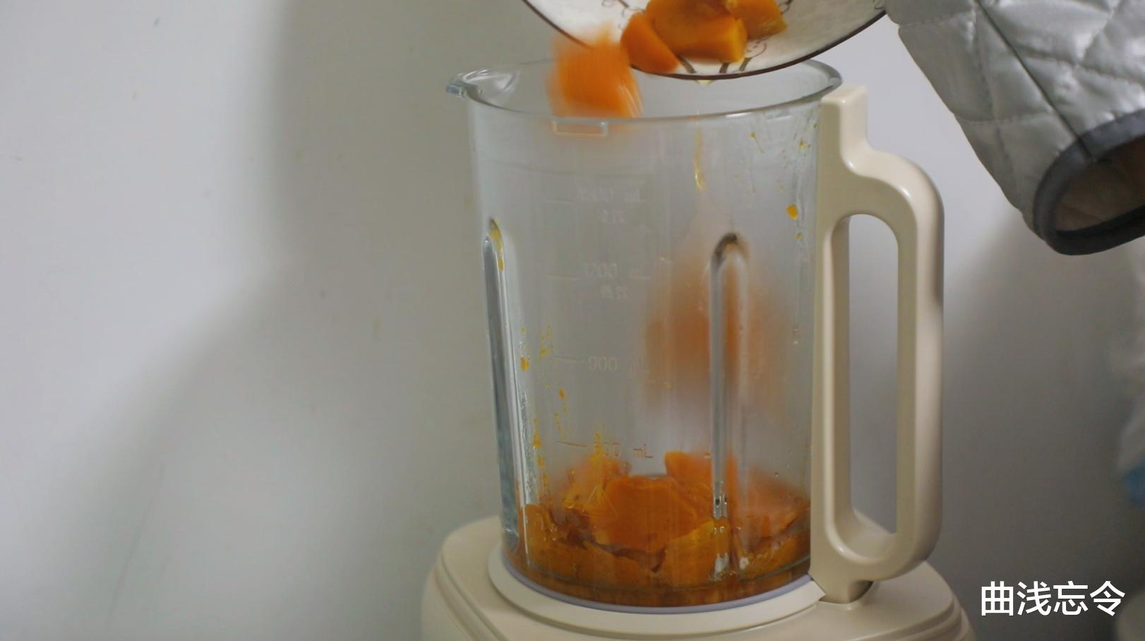 2、打南瓜泥:蒸好的南瓜趁热放入料理机,搅打成细腻的南瓜泥,晾凉备用。
