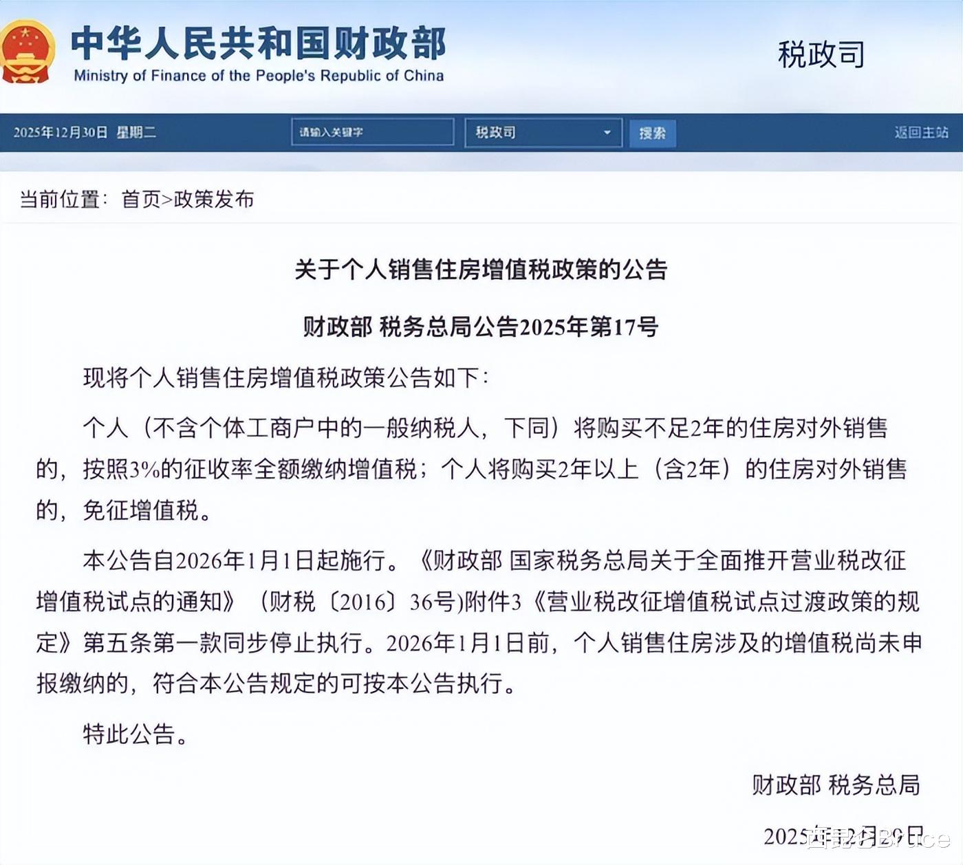 根据12月30日联合发布公告,明确自2026年1月1日起,个人销售购买不足2年的住房,增值税征收率将从5%下调至3%。