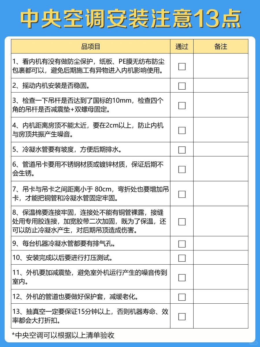 📝给大家总结了中央空调安装的13条注意事项,详细见图5~可以把表格打印出来,验收的时候一条一条仔细对比哦‼️