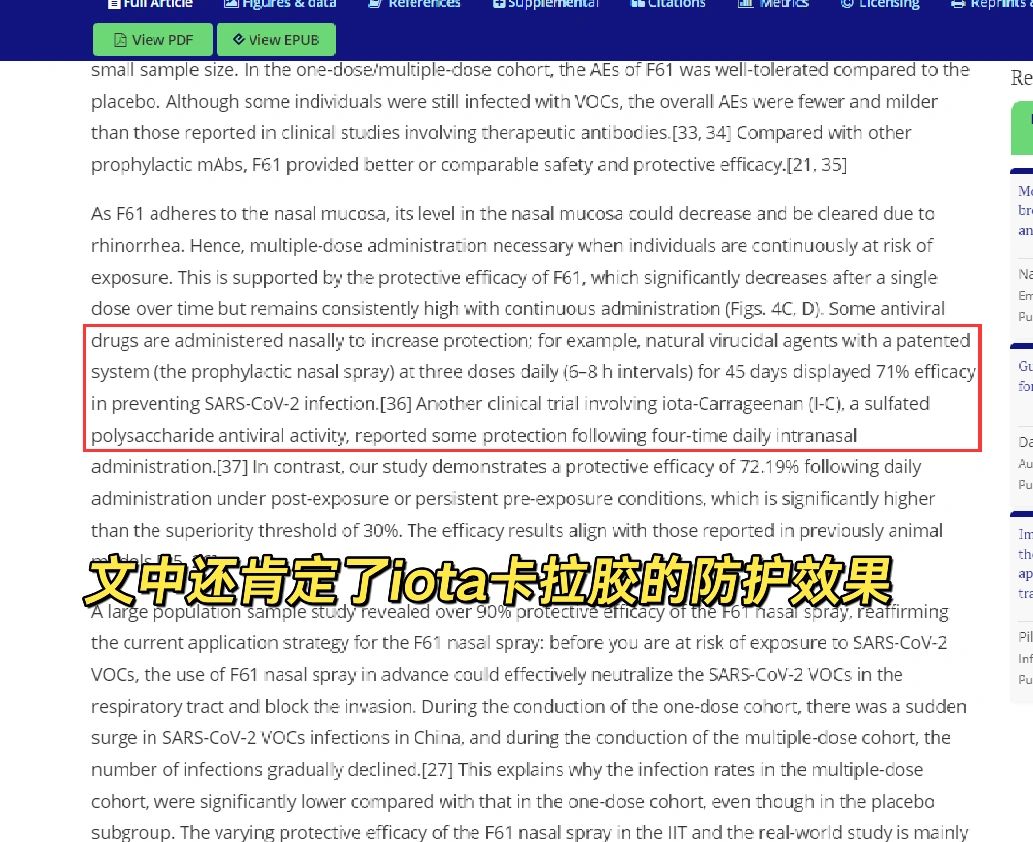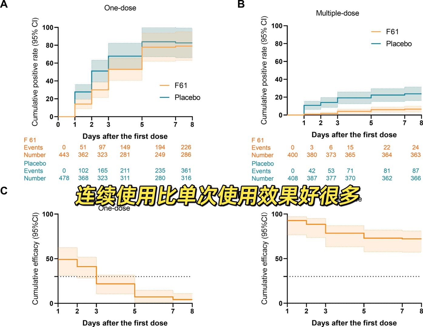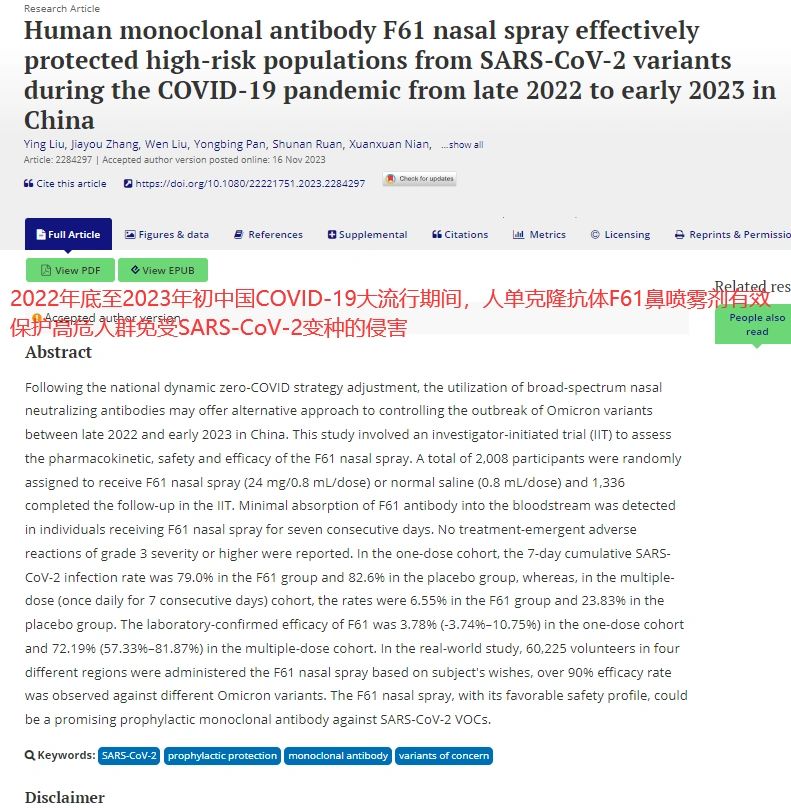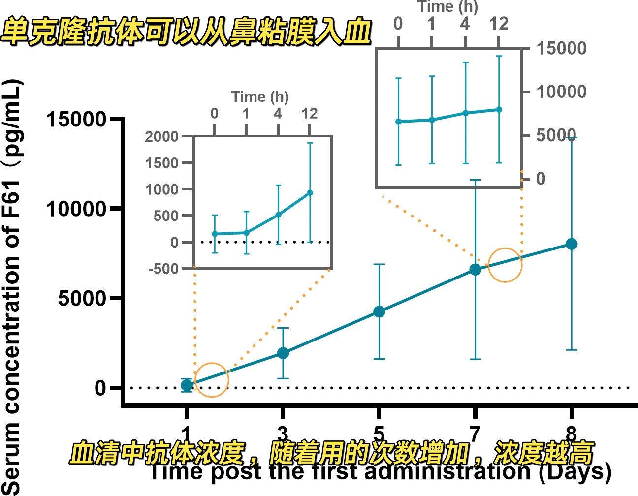 目前市面上的抗体鼻喷,都没有临床试验,而中国生物未上市的F61鼻喷,作为一款单克隆抗体,终于有相关的临床研究成果可以借鉴了。明确下论文重点: 1.单克隆抗体可以从鼻粘膜入血,血清研究显示随着喷的次数增多,血清中相关抗体含量越高。但是含量较低,以pg为单位。 2.多剂量给药队列,F61鼻喷雾剂的保护功效(95% CI)为72.19%(57.33%–81.87%) 3.在4个地区进行的真实世界试验,F61鼻喷的保护功效均大于90%。