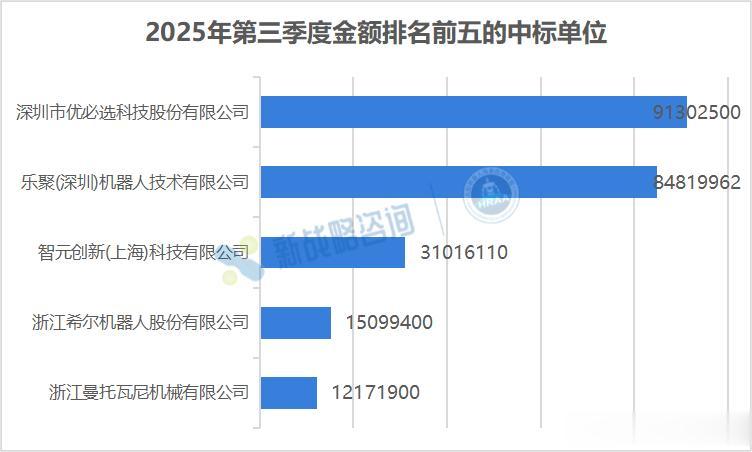 从金额看,深圳市优必选科技股份有限公司以9130万元中标金额居首,乐聚(深圳)机器人技术有限公司以8481万元紧随其后,智元创新(上海)科技有限公司排名第三(3101万元)。三家合计中标金额占比超66%,体现出技术成熟度高、交付能力强的厂商在当前阶段占据绝对优势。