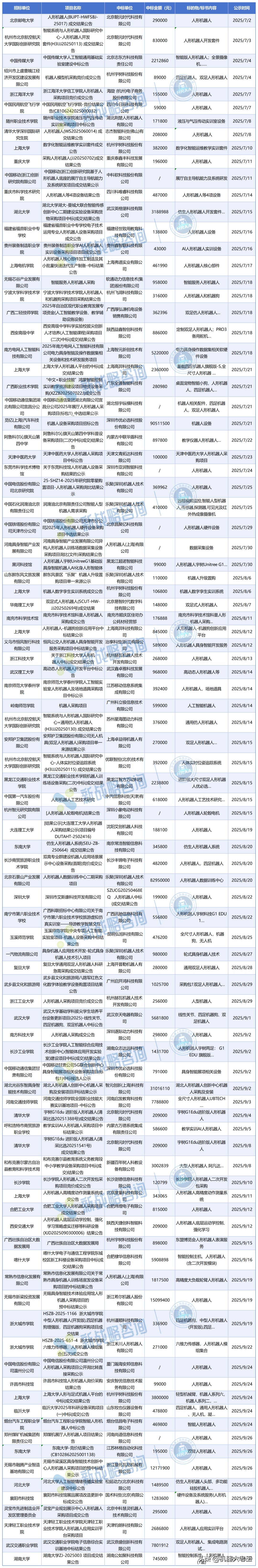 据人形机器人场景应用联盟不完全统计,2025年第三季度,国内公开披露的人形机器人中标项目数量已超过94个,披露的合同金额合计近3.2亿元人民币。(不包括面向K12教育的小型桌面设备机器人,不包括基地及实验室工程建设项目)