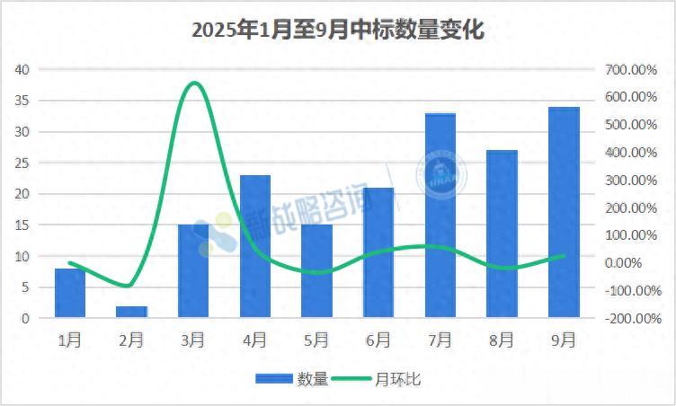 相较于上半年,三季度中标数量显著提升,显示出下游需求加速释放、招采频次密集、人形机器人产业化正步入实质性进展阶段。(延伸阅读:83项,3.3亿 - 2025上半年人形机器人中标情况全解)