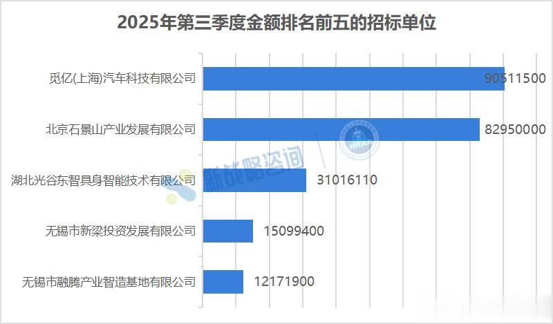 企业客户成为最主要的采购金额来源。觅亿(上海)汽车科技有限公司、北京石景山产业发展有限公司、湖北光谷东智具身智能技术有限公司位列前三,分别采购9051万元、8295万元、3101万元,占总金额的29%、26%、10%。这类企业多为产业园区运营方、新能源汽车企业或具身智能平台型公司,具备较强的技术集成能力与场景试点需求。