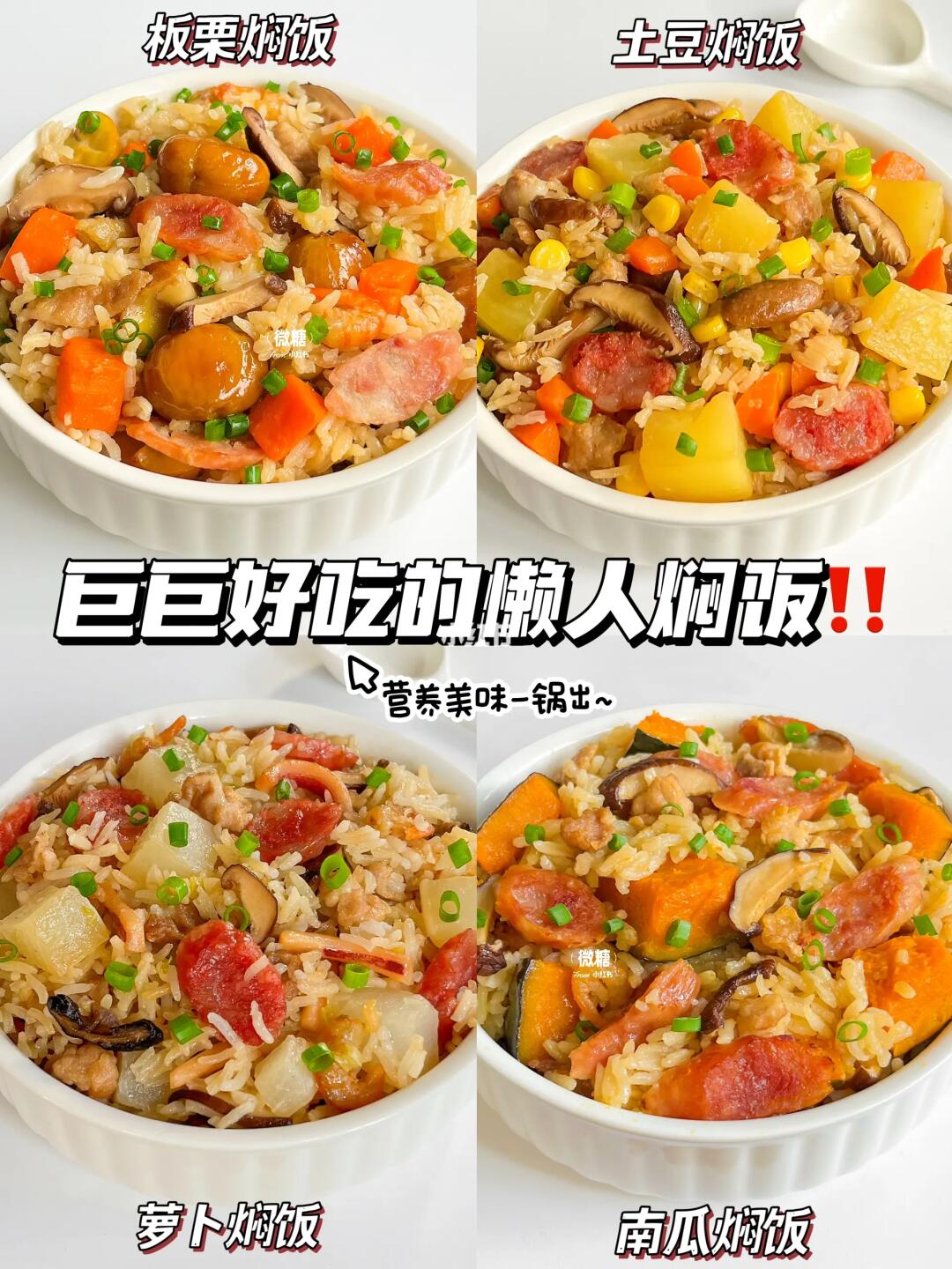 不管是自己带娃的美妈们,还是上班族的姐妹,没时间做饭又不想点外卖,真的强烈推荐你们试试焖饭‼️真的好吃到破防了~有菜有肉有主食,美味营养一锅端!我朋友家挑食的孩子都能吃两碗😋一学就会,全家都夸。都去做‼️ 🍚板栗焖饭 🍚土豆焖饭 🍚萝卜焖饭 🍚南瓜焖饭 喜欢的宝子们快去试一试吧~
