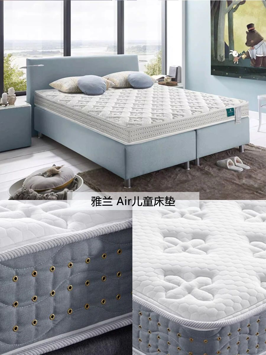 air空调恒温面料+天然乳胶+代棕棉+儿童专用型弹簧+椰棕,面料透气舒适,床垫支撑力强,适合儿童青少年。