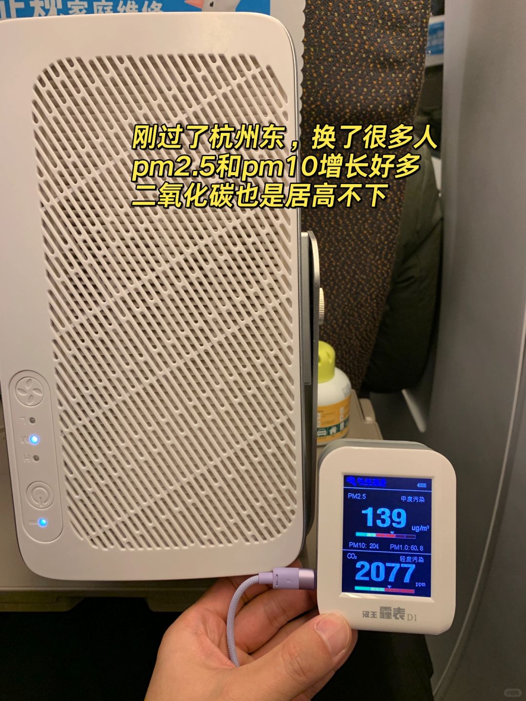 [哭惹R]没想到第一班高铁的二氧化碳2000多,怪不得带着口罩很闷。[哭惹R]第二班高铁车厢也是全部坐满,二氧化碳1200多,不过很快到1300多了。空气差的很。