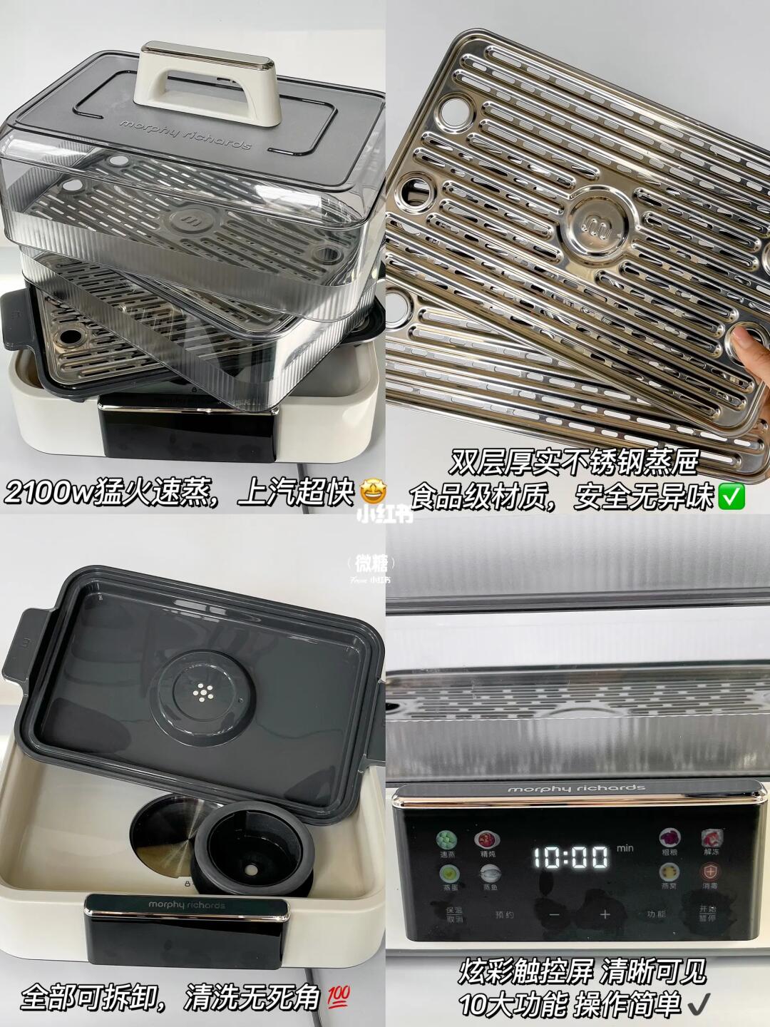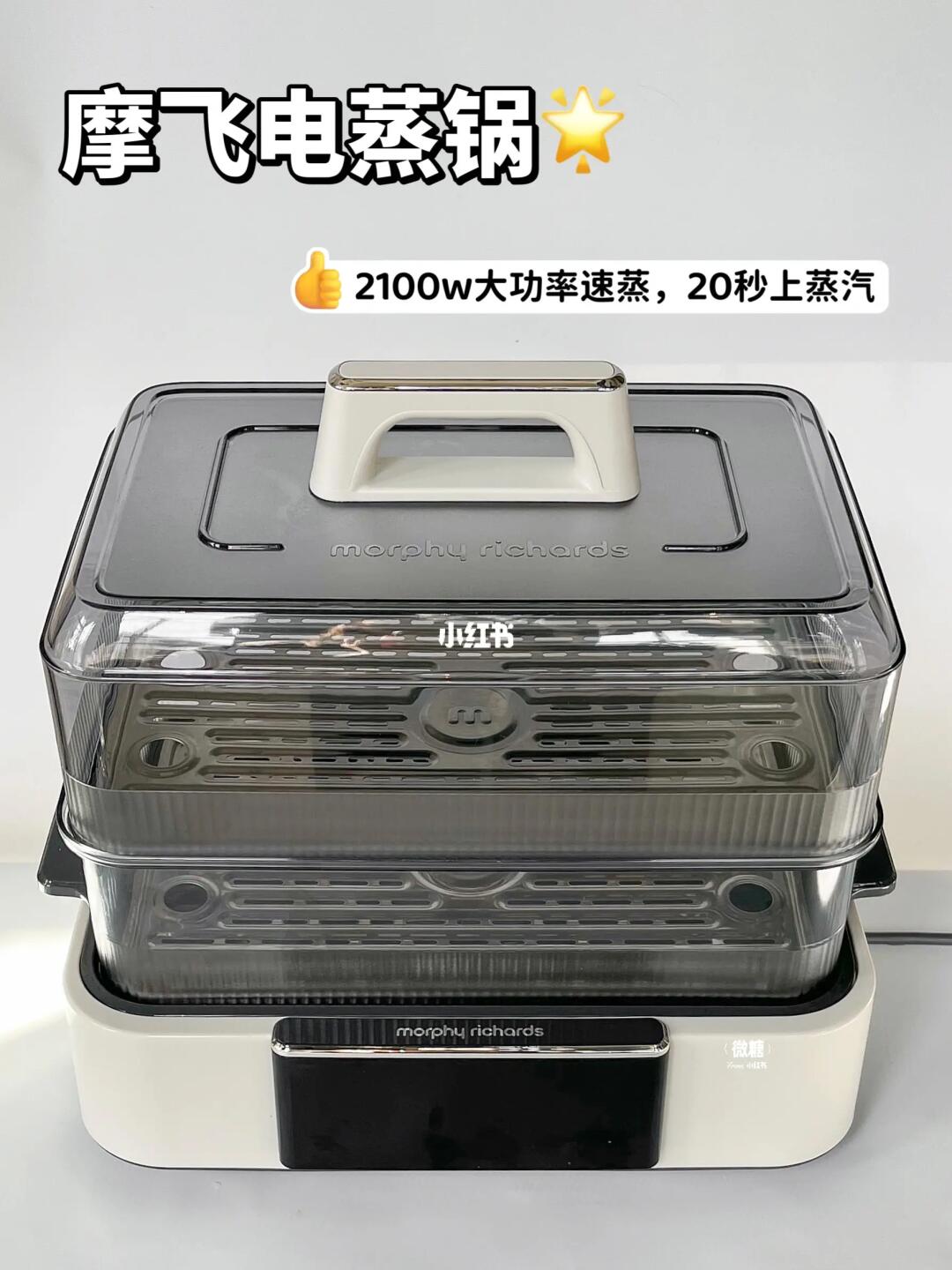 用到的这款摩飞电蒸锅💡2100w大功率就是不一样,20秒就哗哗冒蒸汽!紧锁住食材的新鲜,蒸出来的肉质原汁原味更鲜嫩👍🏻大容量上蒸下炖,自由拼搭不串味,营养一锅出😆效率真的超高‼️还有12小时预约功能,早上时间紧迫的话,可以前一晚预约蒸炖,起来就能吃✅最贴心的是防干烧保护,再也不用守着锅啦🥳蒸屉用到的都是食品级材质,安全无异味,用着更安心🥰