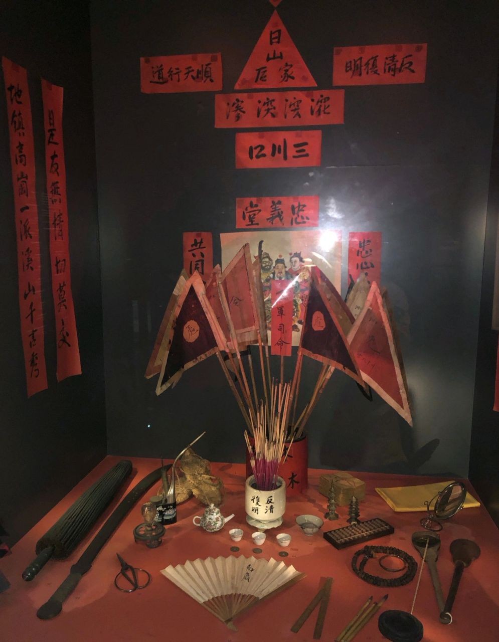 新加坡发现的这座香堂,其内部结构与大陆已发现的天地会遗址一致:正殿供奉“万云龙”牌位,两侧墙壁刻有“天地玄宗,日月同光”的入会誓词,地面残留的香灰层厚度达30厘米,足见当年活动之频繁。这座建于1830年前后的香堂,主要收纳流亡会众、筹措抗清资金、联络海内外反清力量。碑刻中“南洋聚义,静待时机,挥师北上,复我汉家”的文字,清晰展现了其海外存续的抗清初心。当时,天地会通过南洋的华人商会、矿业作坊筹措资金,将药材、兵器等物资秘密运回大陆,支援各地的抗清起义。香堂内发现的数十件兵器残件,包括锈迹斑斑的砍刀、长矛矛头,经考证均为清代中期的制式兵器,显然是会众秘密囤积的抗清物资;一块残破的“忠义堂”匾额,背面刻有数十位会众的姓名,其中多人的名字可与大陆史料中记载的抗清义士对应,印证了他们从大陆流亡南洋后仍未放弃抗争的决心。香堂后殿的墙壁上,留有用朱砂书写的绝笔诗:“生为汉人骨,死为汉家魂;宁为抗清死,不做顺民臣”